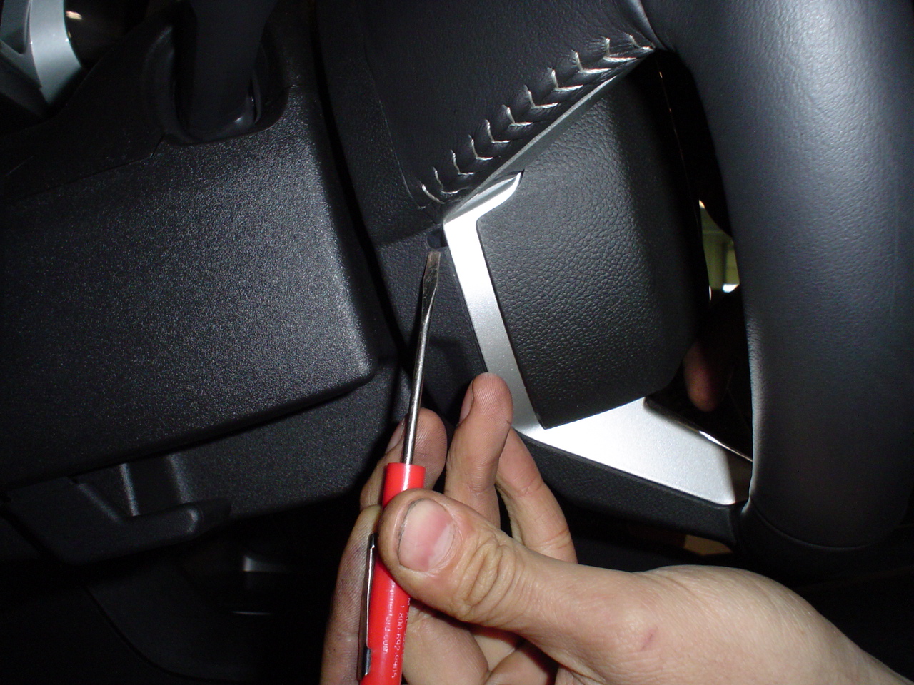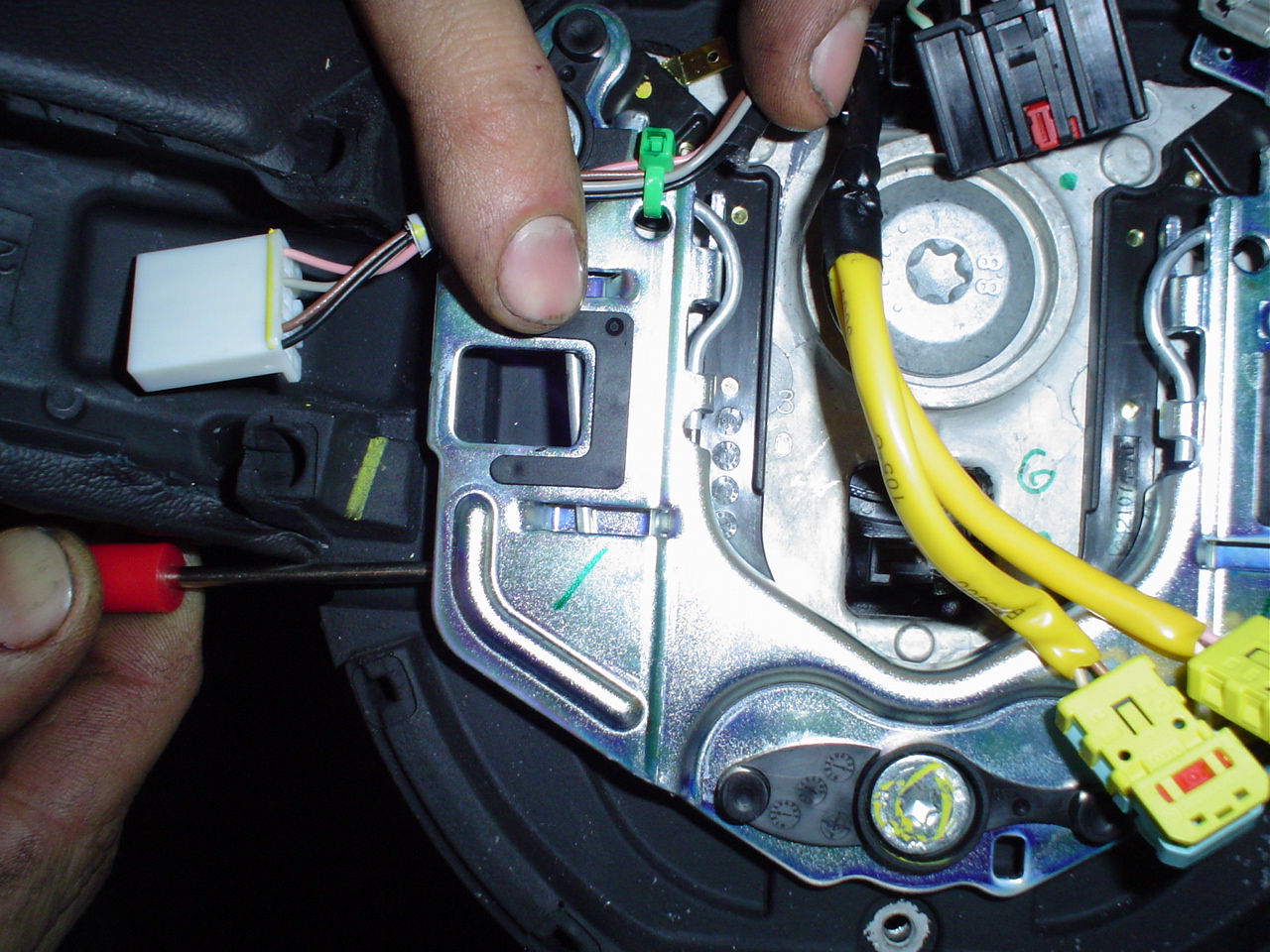 first step as always is to disconnect the battery so as to not set off the airbags. dont be afraid of them if you are careful they are not a problem with no power. there is a small hole in the side of the steering wheel insert a small tool i use a flat blade pocket screw driver and push in on the metal tabs i took pics of the tabs w air bag off to show you what you are pushing against