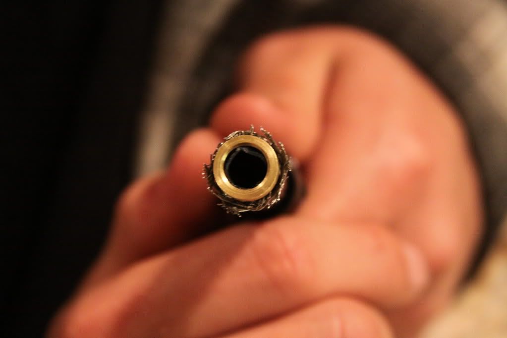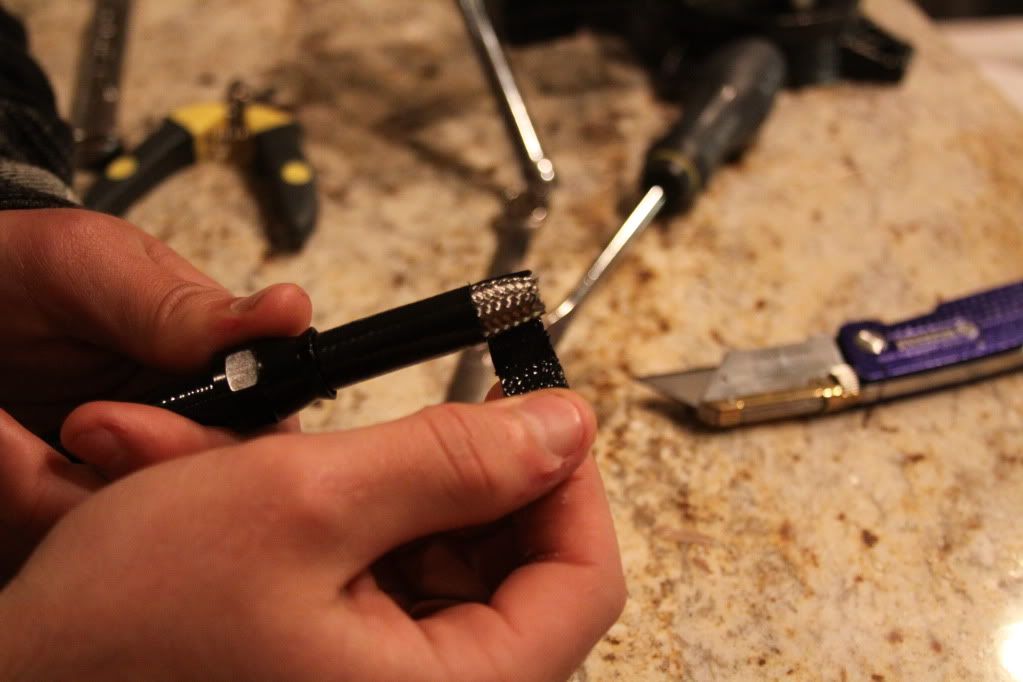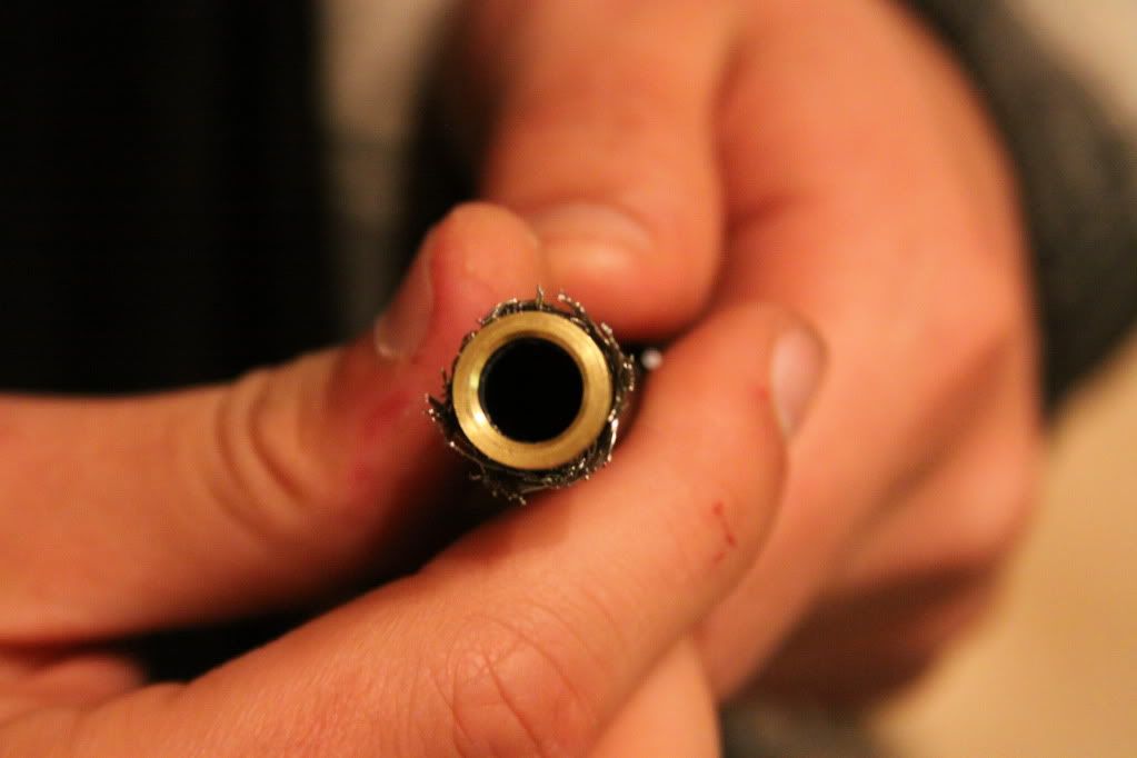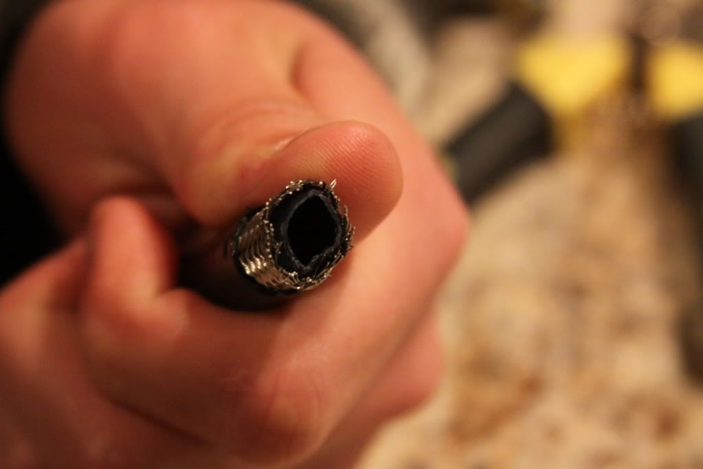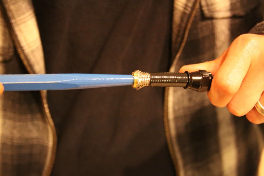 Next, came putting the brass farrel between the braiding and Teflon hose. You can see the the teflon is not sitting flush with the farrel.