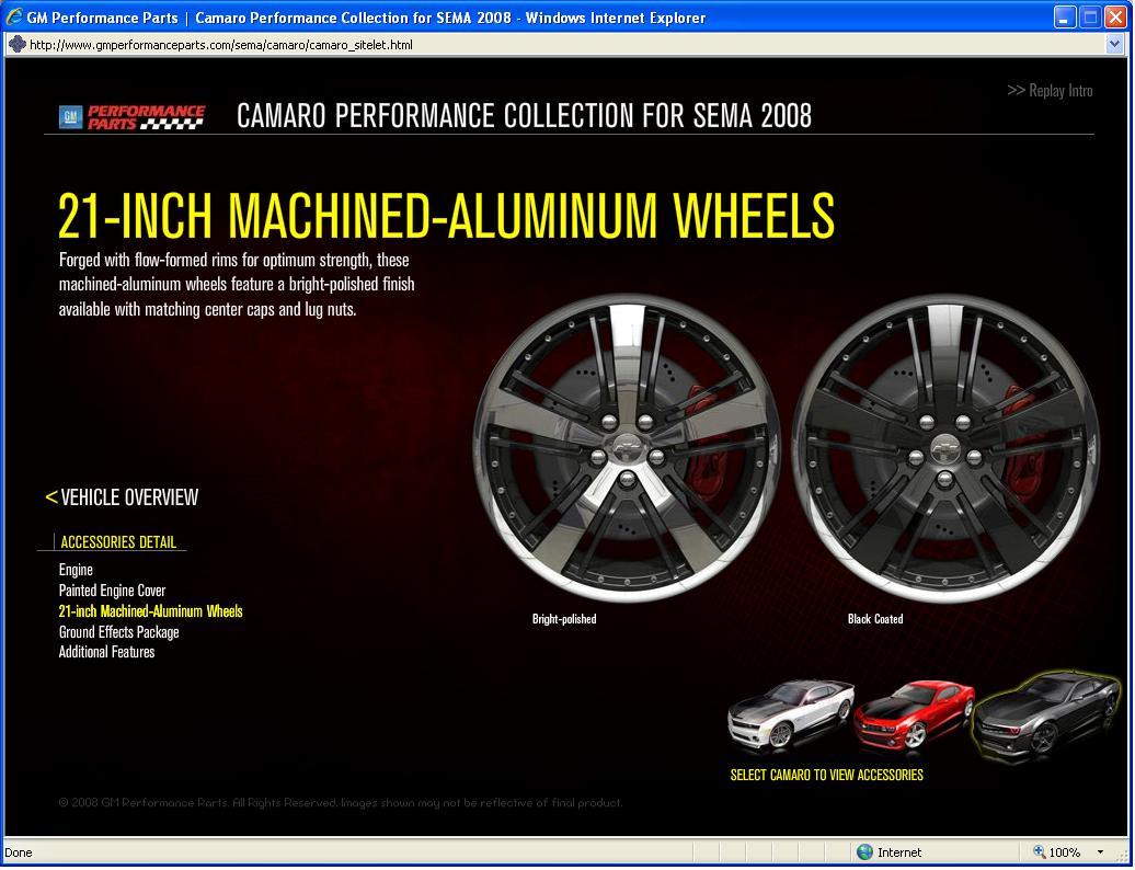 Here are the 21s -- the ones on the camaro black we are pretty sure had a special finish and won't be available as an option -- only these two. You can see more pics in the spyshots thread -- look for the SEMA black and SEMA yellow cars