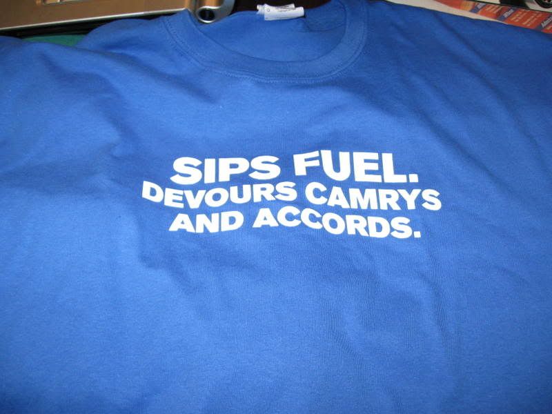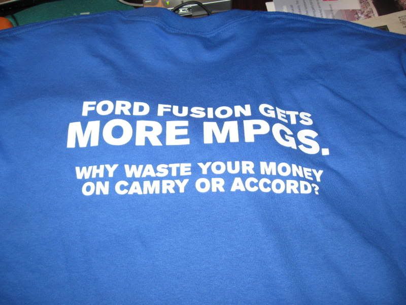 This is why Ford's marketing department kicks ass. Free T-shirts for the new Ford Fusion... Front: ![]() Back: