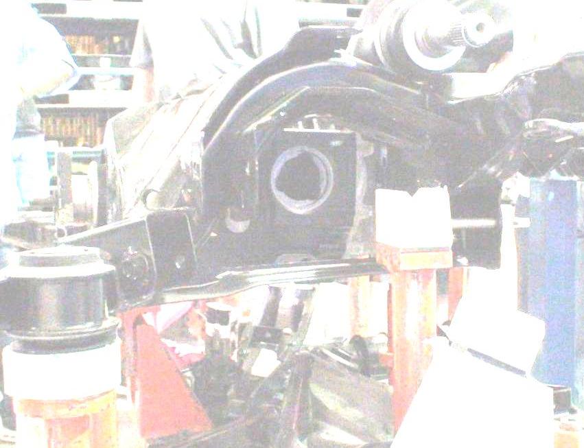 In the lower picture, look for an oval-ish shinier flange right below the large round axle shaft port. Part of what I'm trying to draw attention to is obscured by a lower cradle brace I believe.