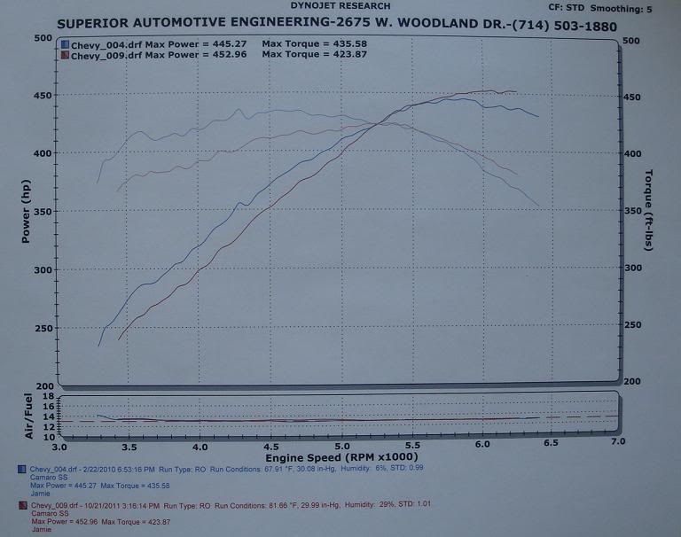 Here is a comparison of my previous best vs the new times. Old Setup Car/Engine: 2SS/RS w/L99 Top Ten Class: Internal Engine Mods plus Bolt-Ons Tires used on the pass: Nitto NT555R 305/40/20 Drag Radial Rear; Stock Fronts Performance Mods: Engine/Heads/Cam, Headers, Exhaust, CAI, Converter, Tune. Name/Location of the track: Auto Club Dragway Date of pass: 2/28/2010 Weather conditions: OK New Setup Car/Engine: 2SS/RS w/L99 Top Ten Class: Internal Engine Mods plus Bolt-Ons Tires used on the pass: Nitto NT420S 295/30/22 Street Tire Rear; NT 420S 265/35/22 Fronts Performance Mods: Engine/Heads/Cam, Headers, Exhaust, CAI, Converter, Tune. Name/Location of the track: Auto Club Dragway Date of pass: 10/29/2011 Weather conditions: OK NA ...................Old Setup.........New Setup R/T:................... .128 ................ .057 60':.................. 1.863 ............... 1.893 330':................. 5.212 .............. 5.213 660':................. 7.918 .............. 7.967 660’ mph:.......... 91.16 ............... 89.52 1000'............... 10.229 ............. 10.319 1320'............... 12.172 ............. 12.300 1320’ mph......... 117.58 ............ 113.63 DA....................1350ft ............. 2200ft Corrected ET..... 11.995 ............ 11.985 Corrected MPH.. 119.344 .......... 116.687 So I went faster with the new setup even though I was running 22" wheels with street tires and had 100lbs of junk in the truck, lol. Also, the dyno shows it lost a lot of tq down low and gained 7hp with the new cam. The potential was there(see MPH) in the old setup to run 11's but the tranny was hanging up at every shift. The new tranny tune that Tampa Tuning sent me was the turning point it shifts quick and firm. Nitrous(100) ...................Old Setup.........New Setup R/T:................... .657 ................ .147 60':.................. 1.889 ............... 1.912 330':................. 5.075 .............. 5.040 660':................. 7.633 .............. 7.604 660’ mph:........... 96.94 .............. 96.55 1000'................. 9.846 .............. 9.794 1320'............... 11.726 ............. 11.641 1320’ mph......... 120.54 ............ 122.13 DA....................1548ft ............. 2896ft Corrected ET..... 11.525 ............ 11.238 Corrected MPH. 122.682 ........... 126.605 Here is a dyno comparing the old VVT cam vs the new non-VVT cam. Only two things changed were the cam and the heads. The new heads are LSA's with a bigger chamber to lower cr(10.38 vs 9.28) vs the old L92 heads. You can clearly see I lost a lot of low end tq getting rid of the VVT. The only reason for the change is to be able to run a lot of boost. Same dyno just different days. Blue is VVT Red is after LS3 conversion.