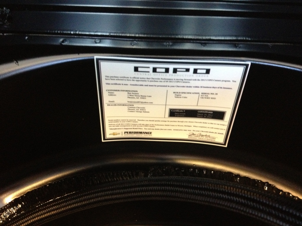 I just the honor of looking at a 2012 Copo @ Courtesy Chevrolet in Phoenix AZ.