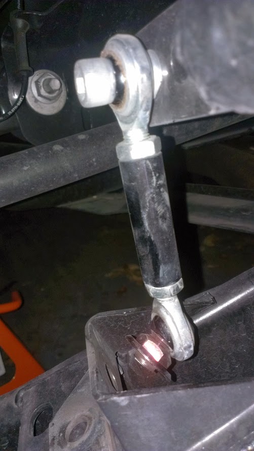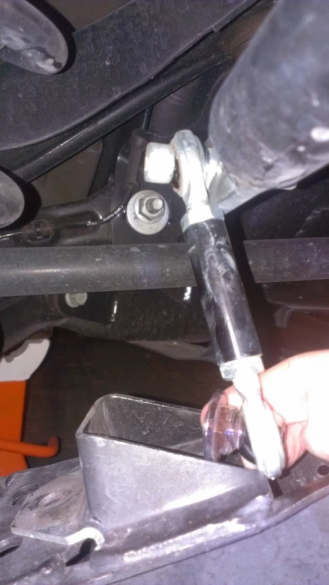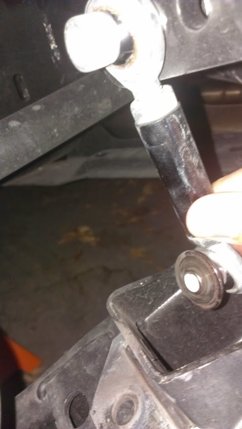 As I was just getting to work this morning I heard a really loud crack sound come from the back end of my car that scared the crap out of me. I got out and looking under the car and everything looked fine. I drove very carefully and slow back home (only a few miles thankfully) with no problems. When I got home I jacked the car up and started inspecting and found the rear driver side end link had snapped off. And of course it was the end with the built in bolt so I can't really fix it, and I'm also out a nut.