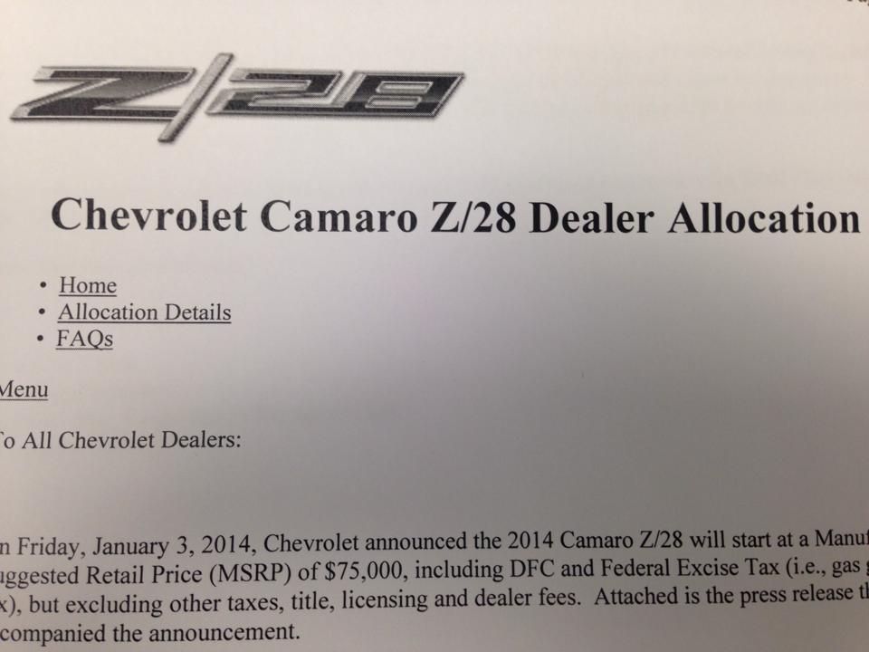 There will be 500 Z/28's for 2014, and 1500 for 2015. No dealer received over 1 allocation for 2014. I found the right one, and they are enthusiasts ![]() He gets 1 for 2014, and 4 for 2015.
