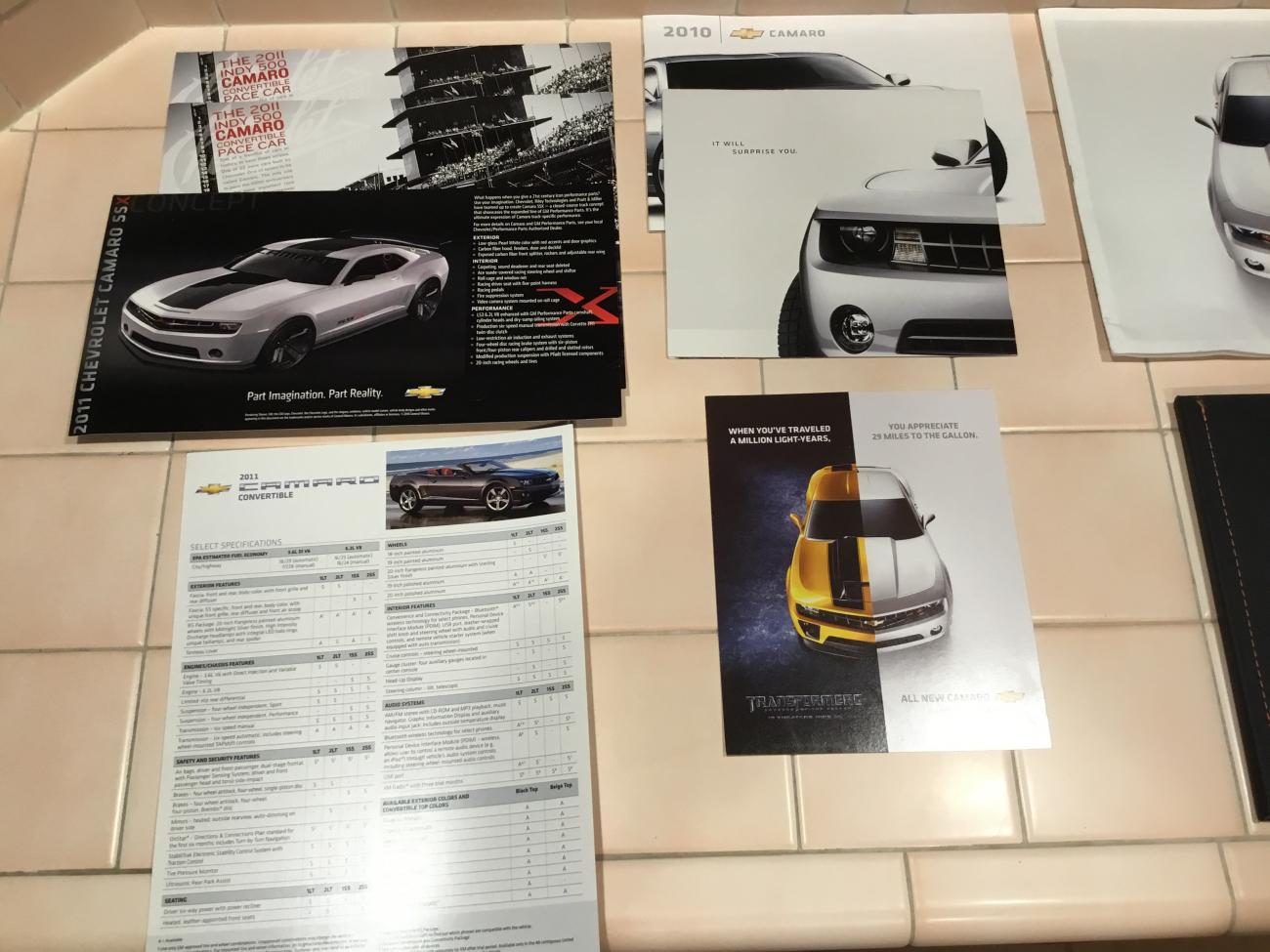 2-2011 Indy 500 Camaro promo shheets 1-2011 Camaro SSX concept promo card 1-2011 Camaro Chevrolet spec sheet 1-2010 Camaro dealer promo book 1-2010 Camaro teaser book 1-2010 Camaro tease promo piece 1-2010 Camaro dealer brochure 1-2007 Camaro convertible concept book with CD from Detroit Auto Show 8-2010 editions of various automotive publications featuring 2010 Camaro PM me if interested...... $100 is the price and includes very protected shipping.