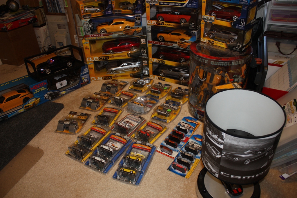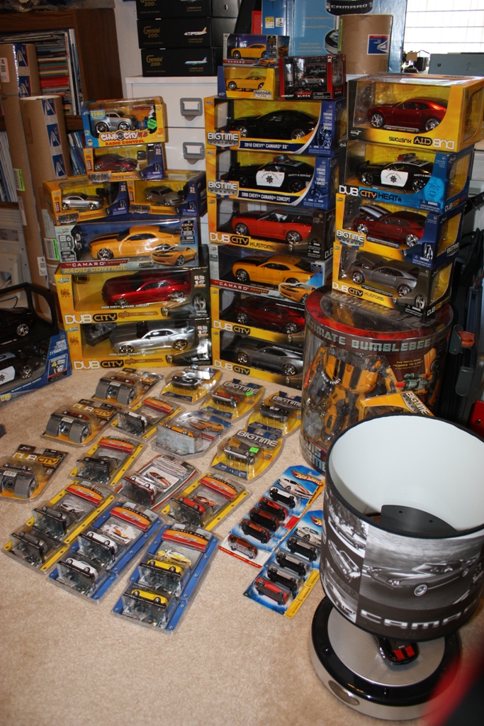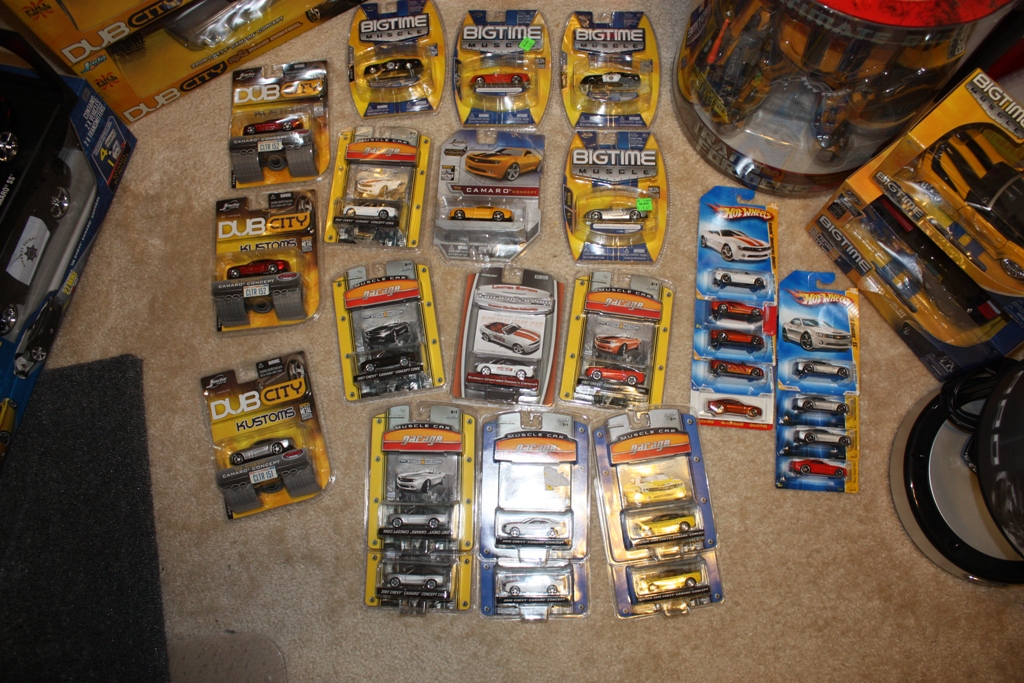 1:64 Scale hot wheels -Qty- 67 LA Auto Show Hot wheels Camaro Convertibles (1 Signed by Scott Settlemire) $100 + S&H for ALL 67 cars -Qty- 9 Blue ZL1’s -Qty- 3 Red ZL1’s -Qty- 1 White SS w/ Orange Stripes vert -Qty- 4 Silver SS Coupes -Qty- 1 Red SS Coupe -Qty- 1 RJT SS Coupe -Qty- 2 Hot wheels Edition cars -Qty-1 White Police Car ***THIS ABOVE LOT OF CARS IS SOLD*** Green Light Collection 1:64 Scale -2009 Daytona 500Pace car -2009 Indy Pace Car -2011 Daytona 500 Pace Car -2011 Bondurant Camaro SS -2011 Camaro SS in gray primer -2012 Copo Camaro -2012 Copo Camaro 1 of 9024 -2012 45th Anniversary SS Convertible -2012 Camaro 1LE Concept ($75 for the Lot Above SOLD as a SET) Green light Muscle Car Garage 1:64 Scale -Orange Convertible w/ black stripes -White Convertible w/ orange stripes (Camaro Z28.com Limited Edition Die Cast) -Pace Car Coupe (white w/ orange stripes) -Pace Car Convertible (white w/ orange stripes) -Qty 2 Silver Convertibles -Qty- 2 White Coupes w/ Orange Stripes -Qty 2- Yellow Convertibles -Black SS Convertible -Camaro Sunoco Camaro **Limited Edition Camaro Z28.com** ($75 for the Lot Above SOLD as a SET) -Green Light Barrett Jackson “Auction Block” 2006 Camaro SS #001 Die cast” ($25 Shipped) JADA Muscle- 1:64 Scale - Qty-2 Silver Convertible - Orange Convertible - Yellow Concept Coupe - CHP Police Car JADA DUB CITY KUSTOMS 1:64 Scale -Silver Coupe -Qty 2- Red/RJT Coupes ($40 Shipped for the 8 Cars Above) 1/18 Scale Die cast Maisto -Qty 2 IBM (Imperial Blue Metallic) SS Coupe - RJT/Burgundy SS Coupe -Yellow SS Coupe -White Police Car Coupe ($90 Shipped for the 5 1/18 scale cars above) JADA DUB City 1/18 Scale Die Cast -RJT Coupe (40th Anniversary Package) -Silver Coupe (40th Anniversary Package) -Yellow Coupe (Concept Camaro yellow) -Orange Convertible w/ black stripes (JADA KUSTOMS) -Black & White highway patrol police Car ($150 for the 5 1/18 Scale cars above) 1/24 Scale JADA (BRAND NIB) -RJT SS Coupe (DUB CITY KUSTOMS) -RJT SS Coupe w/ white stripes (BIG Time Muscle) -Silver SS Coupe (DUB CITY KUSTOMS) -Black/White Highway Patrol Police Car (DUB CITY HEAT) -Yellow SS Convertible w/ Black Stripes (Concept) ($65 Shipped for the 5 Cars above) 1/32 JADA -Yellow SS Coupe -Yellow SS Coupe Concept ($35 Shipped for the 2 Cars Above) **CUSTOM JADA 1/18 Scale Black SS** Texas undercover Police Car FULL LED Police lights in windshield, rear window, headlights, fog lights, and tail lights. (several programmable light options) ($125 Shipped for this custom LED unmarked police car) **Luxury Collection** 1/18 Scale Black ZL1 Coupe “Resin model” very heavy and detailed full interior detail. Wheels have been painted black. Only 50 Pieces made. Comes in a black box with ZL1 printed on it. Also the box is Signed by Scott Settlemire. ($105 Shipped for the ZL1 Die cast) R/C Cars 1/10 Scale Vaterra ZL1 Comes with both the Red and Black body tops. Also included are 2 sets of Black 10-spoke ZL1 rims (also comes with the stock rims on the Vaterra ZL1) Remote, Charge, Battery, Tire Lug, and Original box included (this is a used item in Great shape runs perfect) ($235 Shipped for the RC Vaterra ZL1 w/ both bodies) XQ R/C Car (BRAND NIB) 1:10 Scale -XQ 1/10 Scale RC Car Silver SS w/ SLP ZL hood w/ black stripes -XQ 1/10 Scale RC Car RJT SS w/ SLP ZL1 Hood ($50 Each Shipped or $90 Shipped for both) JADA HEAT 1/18 Scale Combo Back (BRAND NIB) -06 Dodge Charger Daytona R/T & 06 Chevy Camaro Concept Police Car ($50 Shipped) 1/18 Scale JADA RC Cars (BRAND NIB) -Silver 2006 Chevy Camaro Concept (DUB City) -RJT 2006 Chevy Camaro Concept (DUB City) -Yellow 2006 Chevy Camaro Concept (DUB City) $35 Each Shipped or $95 Shipped for the 3 cars Shipped) -1/32 Scale Silver Jada Big-time Muscle RC Cars (BRAND NIB) Qty- 2 ($35 Shipped for the 2 Cars) ***Transformers Ultimate Bumblebee Figure Ultimate Bumblebee (Costco Exclusive)*** I have never seen these again, every once in a while they appear on EBay the last one I saw was 2013 NIB sold for $618. They offered 2 versions the Costco version in the round plastic clear container w/ and the Titanium Series Bumblebee Figure included, or the square box w/out the figure. Mine is NIM I did remove the batteries so they would not leak but it’s mint and the package is perfect. ****The Transformers Movie hero "comes to life" at the push of a button! This amazing and ultra-detailed robot figure features an animated head, wings and arms. His cannon automatically "aims" and fires a missile! Convert this awesome machine in to Camaro concept vehicle mode with battle and conversion sounds! Groove to nine different songs, featuring "Whip It" by Devo! You'll be ready for action with realistic revving engine sounds, screeching brakes and crashing noises, even a car alarm and horn! And with 17 cool phrases like, "Let's roll out!" and "Take that Decepticon!" he's the ultimate interactive action figure powered up, and ready to bring the fight to the Decepticons!**** ($375 Shipped) ***LIMITED EDITION CAMARO COLLECTORS LAMP SHOWING ALL 5 GENERATIONS FOR THE CAMARO, THE TURN TABLE ROTATES AND LIGHTS UP 1:32 Scale Black 5th Gen is on the table. Lamp, lights, and table work perfectly this is never been displayed or used still in the box. These were available at Dillard’s back in 2009 I never saw them again*** ($115 Shipped)