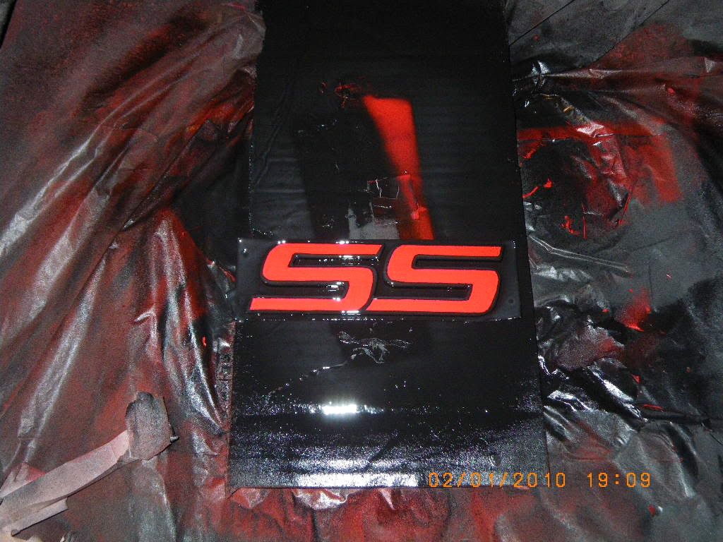 Painted this SS emblem I ordered. Sanded the pearl emblem inlay with 600 grit paper then layed down 2 layers, 10m apart, of Duplicolor adhesion promoter to the whole thing. Laid down 2 coats, 10min apart, of Duplicolor Torch Red. Let dry over night then sanded the whole thing with 800 grit paper and laid down another 2 layers of Red. Let dry for a day. Masked off red parts then cut away the edges where the chrome would be with a razor blade. Sanded exposed edges with 600 grit paper then laid down 2 coats, 10 min apart, of Duplicolor flat black. Let dry all day then srayed another coat. Let dry for a few hours then put 3 medium coats of clear, 15min apart. Letting dry now.