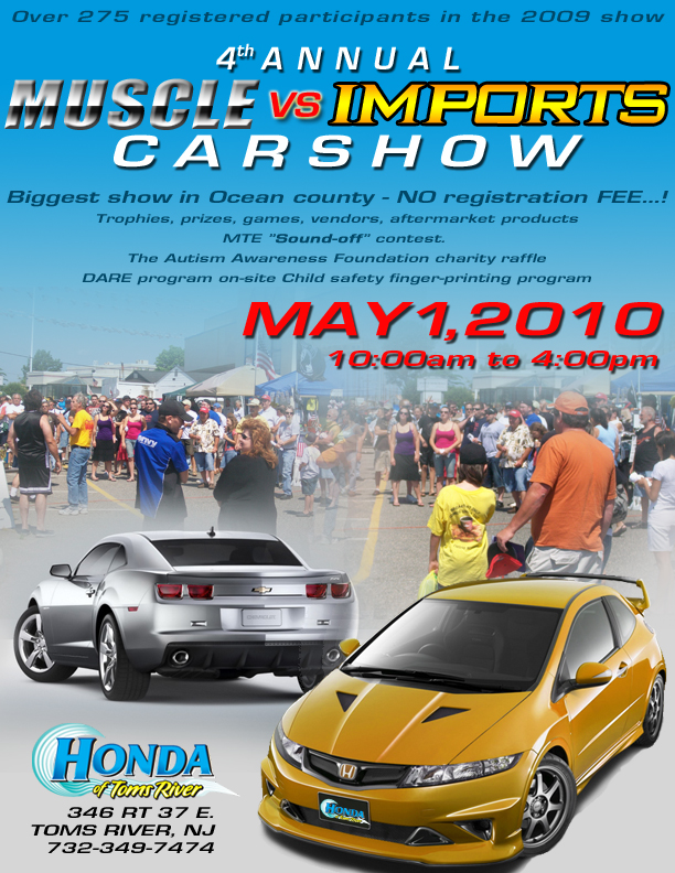 Hello all, I didn't see this posted on here, so I thought I would share. There will be a muscle vs imports show at Honda of Toms River on May 1st. I will be attending and will likely bring the '95, since it is my show car. Anyone else planning on going? I missed the season opener at ECS and would love to see what you all have done to your 5th gens as I am planning to do some upgrades soon. Here's the link for details and to register...