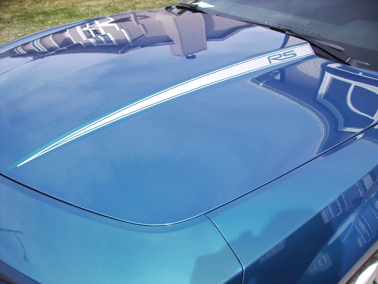Since we like "old school" we went with white rallies out and white stripes inside as well. We want to have our stripes outside painted on and will do that soon. Although, I have to say I like the looks of those hood spears too