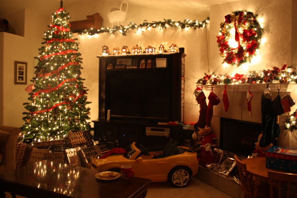 The kids went off to bed I took this photo of the Christmas tree before Santa arrived shortly after I dozed off and I awoke to the sound of an engine revving and low and behold Santa had arrived he filled the room with lots of toys and What was this a 2011 Yellow RS Camaro Convertible My kids will be so happy when they wake up in the morning. Looks like Santa ate a few cookies off the plate the girls left him.