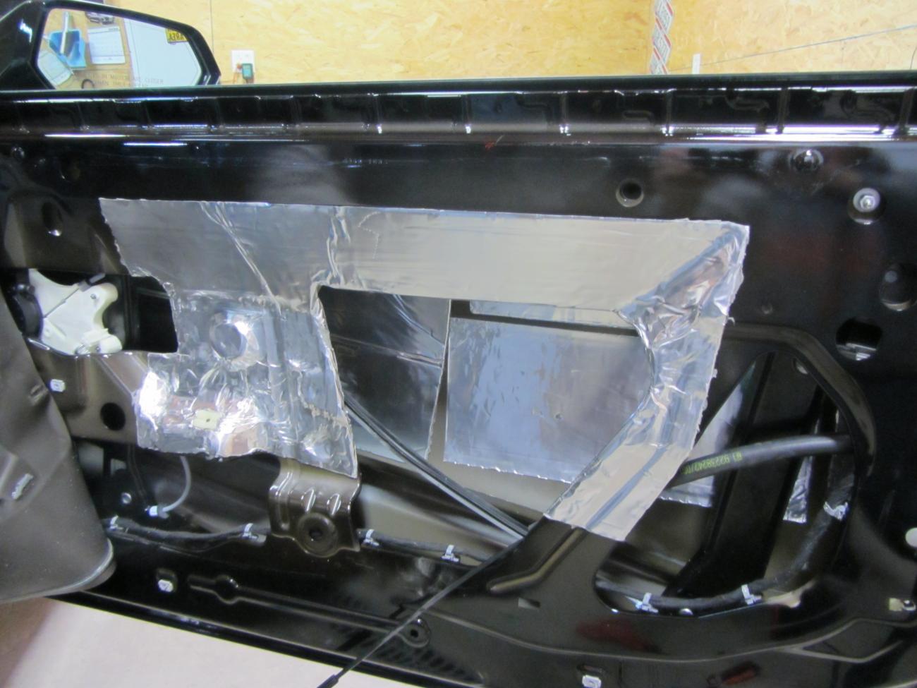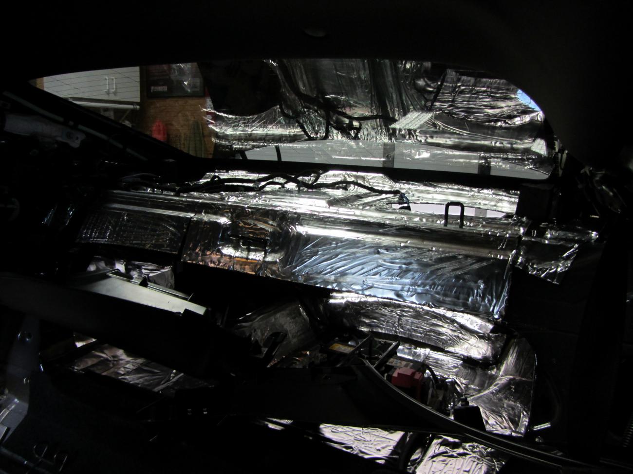 As it turns out, he prefers to remove the interior panels to make the installation easier. He suggested this would be a good time to upgrade the stereo system. Which was very tempting, and I have another topic here containing the parts list I had planned to purchase. But it's not in the budget at the moment. And I don't really have any complaints with the stereo. It could use some more bass, but that's typical of most factory audio systems. In any case, while the car was apart (which was a great deal of stress for me...it is only a week old after all), we took the time to do a little sound proofing. So in went the RAAMmat: It covers the battery area, trunk floor, back panel, inside the rear quarters and up over the wheel wells as far as I could reach, the floor under the rear seats, back deck, roof behind the sunroof, and the doors. It did reduce quite a bit of the road noise I noticed coming from the rear of the car on the highway. Some RAAMmat and Ensolite under the carpeting would have made a huge impact, but I didn't want to go that far. |