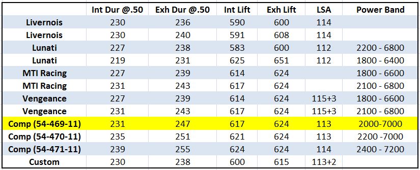 I would like to see the LS3 stock cam, GM hotcam, LS9, and most of the aftermarket cams in a single table. Anyone see a table like this floating around?