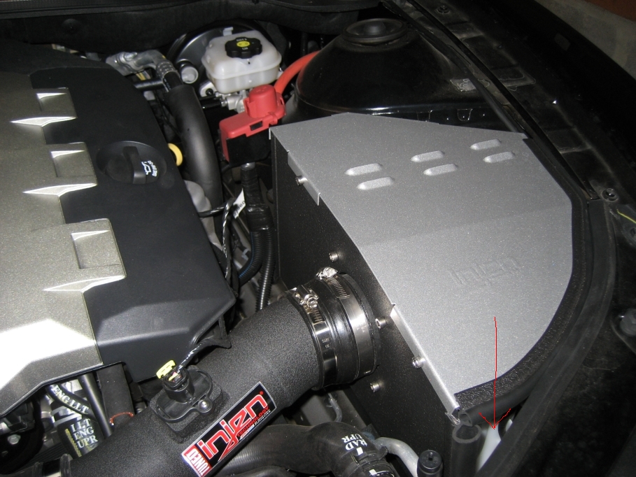 This is the gap I'm talking about (see pic). The Roto-Fab doesn't seem to have that. Also, I wonder how much hot air from the engine bay is getting sucked into those slots on top of the box. Just wondering about some of this stuff, because in the Jannetty shootout, the temp climb for the Roto was 4 degrees (same as stock box) while on the Injen it was 9 degrees. However, this was from the V8 tests.