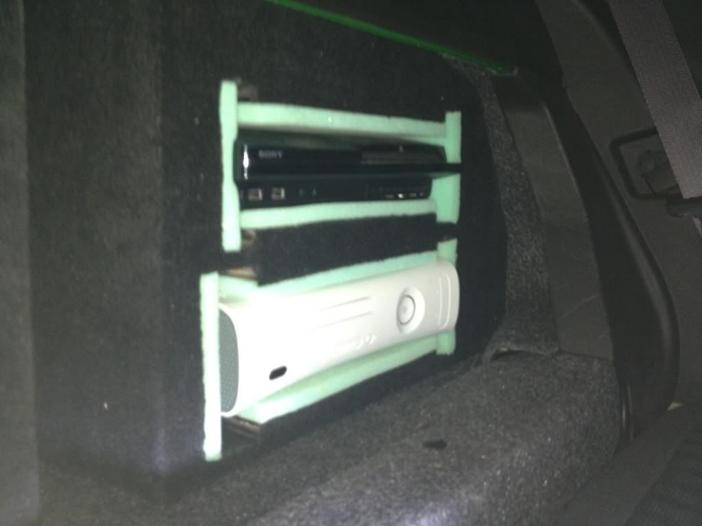 So, I decided to build a sub box and 2 padded shelves one for my PS3 and One for the xbox. Now, I can watch blurays in the car and then play GTA IV all day.