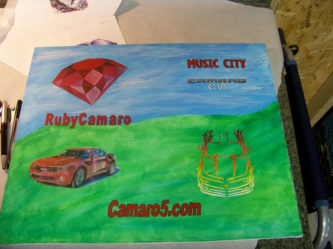 So I have not done enough building to my Camaro to start a build thread and did not think to doccument this painting from the beginning but here is how it looks today. Mind you I am no artist. I just like to play with arts & crafts stuff. It started as a team activity at work. A co-worker whose turn it was to plan an activity brought us each a canvas & we were to do a painting over the course of the next several meetings. Well a few of the meetings got cancelled and I am way too obsessive to complete anything like this in just 3 sessions so mine sat unfinished at home for several months. I have been working on it while on my R&R vacation and here is how it looks now. I still have a good bit of detail work to do and need the silver paint I left at home to add the "CAMARO" between Music City and Club (it will look like the word Camaro on the side of our cars). The framed pic on the left is our club logo from which the right side of the painting was derived. I may add something else under my username but I am not sure what yet. It just looks empty there. What do you guys think?