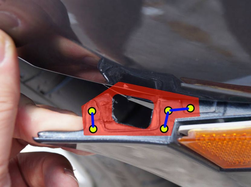 So the area of the fascia where the bolt holds it on has ripped away? This has come up before and I provided an idea for repair to a C5 member. It should work. You may consider trying this. It was specific for a bolt that tore out of the fascia: The red piece shown is aluminum plate. Pretty thin, maybe 0.075" thick. You want two of them, shaped identically. The shape shown re-creates the damaged portion of the fascia. The yellow dots are holes. These holes get drilled into the 'flange' on the fascia, too. One plate goes on top of the damaged area, one on the bottom. Spread some epoxy on the 'flange' so that it will end up in the middle of the aluminum plate 'sandwich' before you apply the 'plates'. It would be a good idea to mask the outide of the fascia with painter's tape before applying the epoxy ![]() Zip ties would be used to secure the 'plates' together, through the 'flange' of the fascia. The blue lines represent those zip ties. Between the plates, the zip ties, and the epoxy securing it all together, it should make an effective repair. The 'buckles' of the zip ties would all be underneath. ![]() The gap between fender and fascia may be greater than you'd like, so play around with the thicknesses of aluminum that will work before you start drilling and using epoxy.