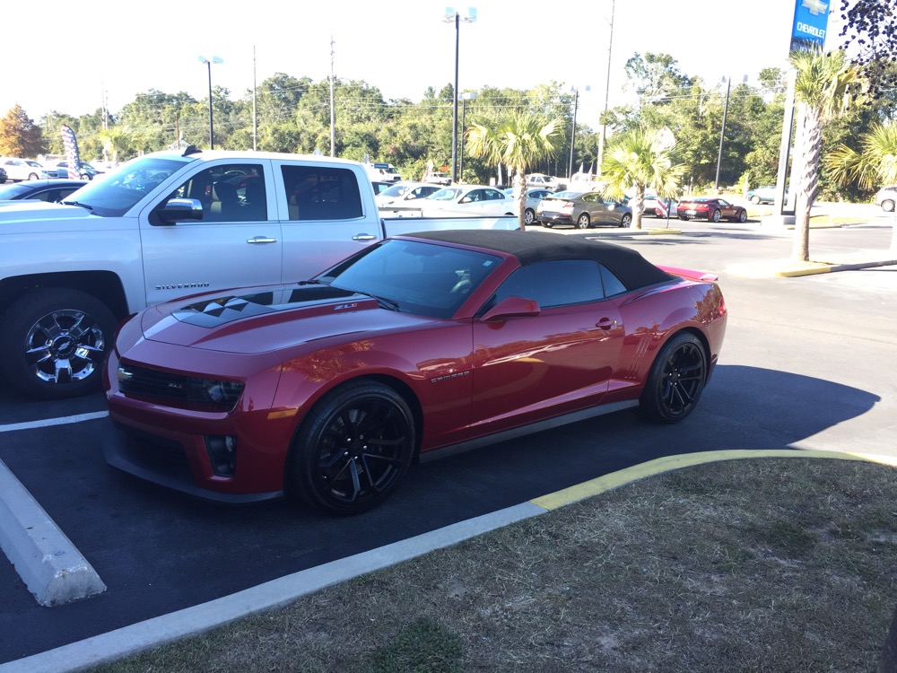 Earlier this year I traded my 2012 1SS M6 along with a 2011 Acadia to get my wife a 2016 Silverado LTZ. I really liked the 1SS but she wanted a new truck and I found a 1968 C10 that I could drive daily so we made the deal, and we LOVE the new truck such a sweet ride. Well, fast forward 6 months to a car show called Emerald Coast Cruizin' in Panama City Florida a couple of weeks ago. I pull in and park my C10 and a few guys start crawling all over the the truck, turns out one of them needed to own it more than I need to keep it. Now I got a pocket full of cash and the wife says how about a convertible Camaro? So I start looking for a 2SS convertible in the Florida panhandle area, only 3 within 150 miles , so we go look at them. First one turns out to have been a rental and it was driven like it was stolen. The next two were both at another dealership; the first was a 2011 yellow on black w/automatic and the second a 2012 white on tan w automatic. My wife liked the yellow but didn't think she could drive it every day, a little to bright. She was indifferent to the white one but we decided to make an offer. The offer was clean trade-in out the door, with the thought that we might get out the door for clean trade-in plus the tax and tag. They wouldn't come off a dollar! I was surprised because we were the only people in a very large dealership on a saturday afternoon, 20 sales people and me, my wife, and son. So we walked. On the 100 mile drive home I decided we should go by and see the "red" ZL1 at another dealership just for giggles. My wife had seen the car and said she didn't want a red one, the car looked fire engine red in the dealer pics,and I figured she'd never go for the price of a ZL1. So we roll into the dealership, unbeknownst to us, that had just closed. We're walking around looking for the car but it wasn't anywhere in sight, I was bummed thinking it had sold. Salesman walks out of the show room and asks if he could help us so I say I though y'all had a ZL1 convertible. He says we do it's around the corner on the used lot, wanna check it out? Of course I say yes. We roll up and my wife says hey that's not red! Then she says, I like that color! Truth be told we had a 2006 TBSS in the same color. Then she say's I like the black wheels, this thing is bad @ss! The guy locks the doors with the remote and then lights it off. My wife jumped at first because she wasn't ready for it. I watch her as the perma-grin sets in, then I look over at the boy with his perma-grin already set. He asks if we want to drive it and the wife shouts heck yeah!! So we take it for a quick ride with both my wife and I driving it. When we get back to the dealership I ask the guy what the number was and he responds, my wife doesn't blink, then I ask if there is any room to move on the number and he says he'll ask. He returns with news that they'll go a G under clean trade-in, wife's grin gets bigger. I'm rolling this around in my feeble brain... I'm thinking, holy crap she want's this car!! He asks if we are interested in seeing the final numbers and the wife responds with, how can we make sure it's not sold before we come back on Monday? Next thing I know she has the checkbook out writing a check for earnest money. My son and I are freaking out! We balked at paying retail for a 2SS just an hour earlier and now we are putting money down on a ZL1 that cost twice as much! Does this stuff really happen? Yes it does my friends, as you all know dreams do come true! We finalized our deal this afternoon on this 2015 ZL1 convertible in Crystal Red Tintcoat with a 6 speed automatic, CAI cold air intake, Kooks long tube headers, and Borla exhaust. I only have a couple pics but I'll get more and better ones tomorrow. We are really looking forward to putting some miles on this beauty.