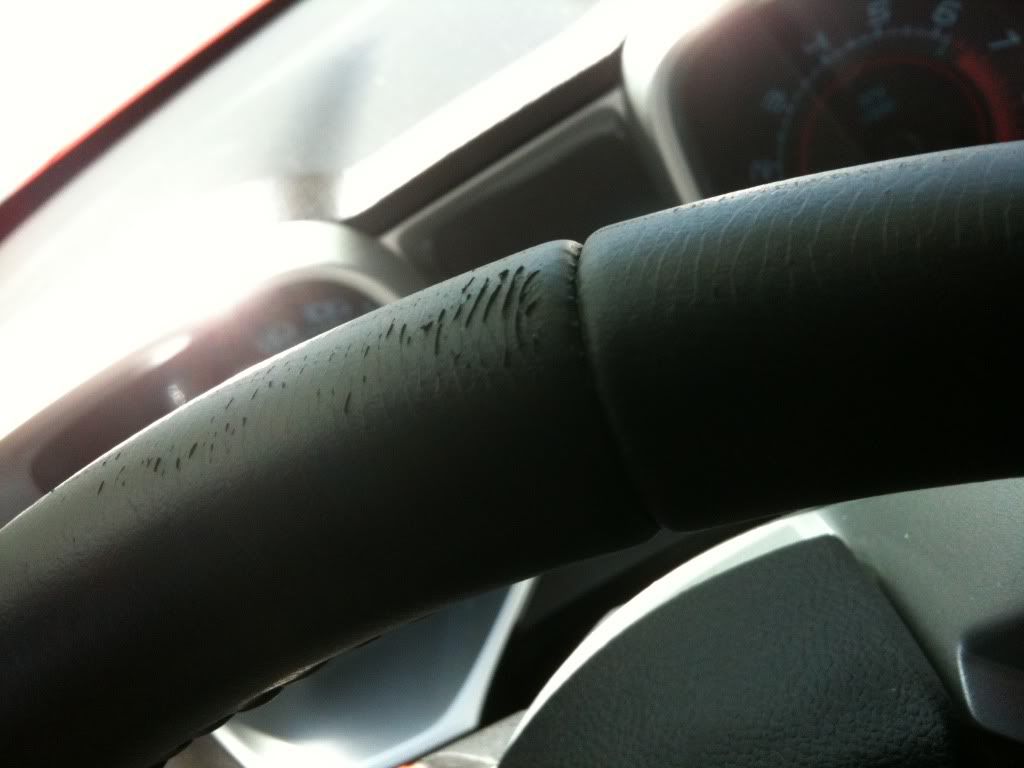 You can see the same pattern in the leather in this spot, this is the upper left hand part of the steering wheel about where I put my hand most of the time.