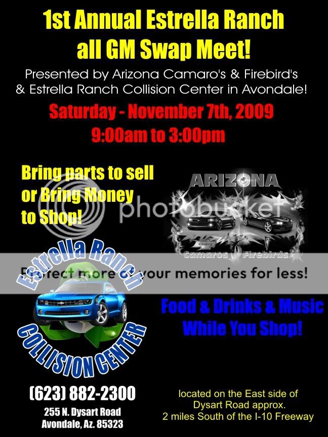 Mike from AZ Camaros and Firebirds asked me to spread the word about a swapmeet that AZC&F and planning on putting on November 7th from 9:00 to 3:30. It will be held at 255 N. Dysart Rd. in Avondale. If you would like to check out the parts or take some parts down to sell, check it out.