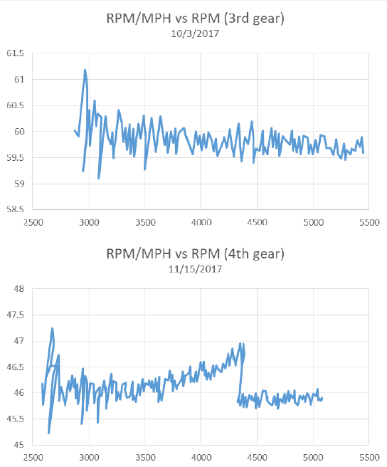 Did a log today in 4th gear and made a plot of rpm/mph vs rpm to compare to the dyno plot. Also looked at a data file I have from a month ago where I logged in 3rd gear for comparison.
