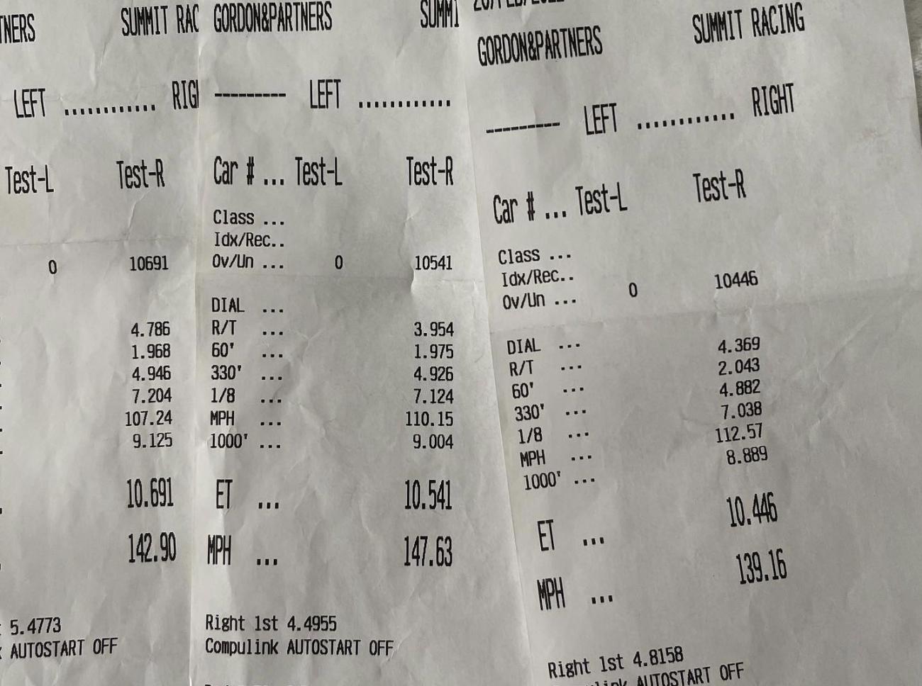 Out of the 6 passes I made, 3 were aborted due to spinning too bad recover. 3k, 3k and 4k leave. The other 3 I left at idle, 2k, and 2500. All of these resulted in 1.9/2.0 60’s. Despite the horrid 60’ times it still went a best of 10.4@139. Highest trap was 147mph. 28x10 MT stiff walled slick and bias ply skinnies. Guys at the track said if I get the 60’ to a 1.6 it would go mid 9s. But until them it looks like I have a 10.50 street car. It was an absolute blast, and my buddy went 8.80@159 in his big single 388 th400 5th gen!