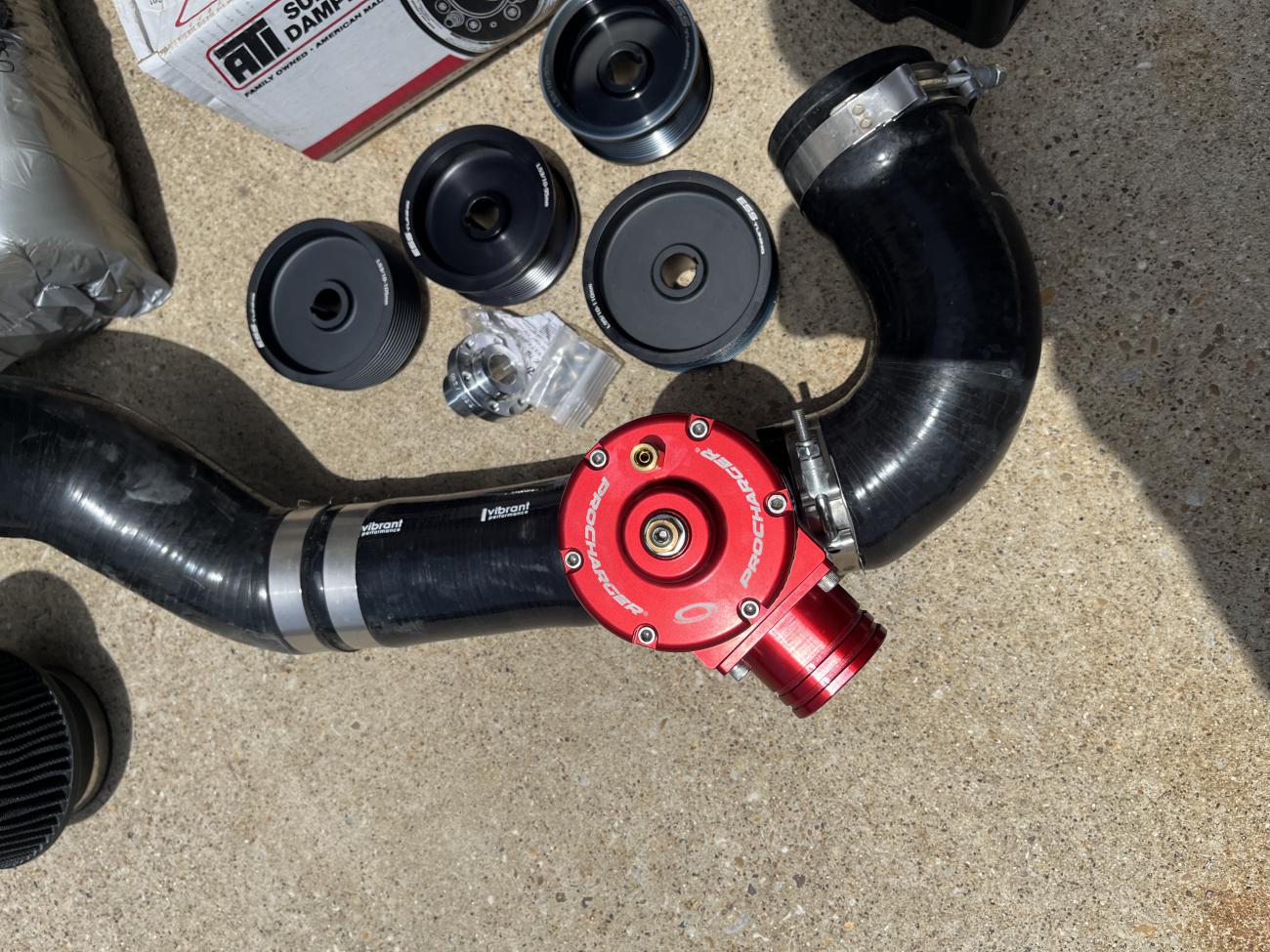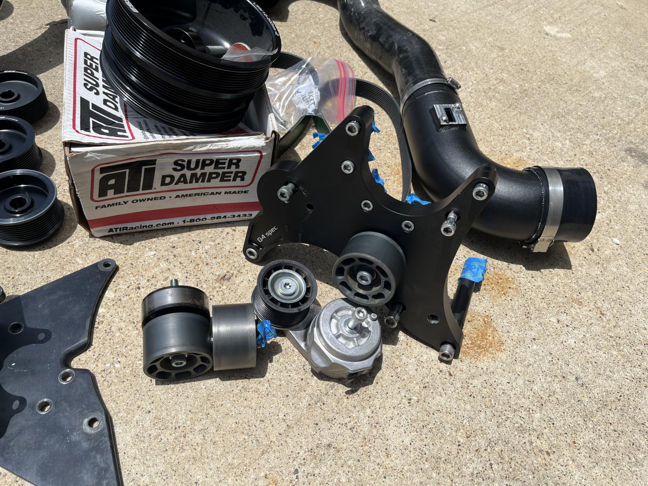 ESS Tuning G4-95 kit. 2500 miles on the kit. 10 track passes. Comes with 110mm, 105mm, 95mm, and 90mm upper pulleys. 200mm lower pulley. Crank pin kit, short belt, long belt, all 10 rib drive kit, supercharger oil kit, fluidyne crank pulley, and procharger big red BOV. I do have the plates for the electric steering 2012-2015 cars. Mine is a 2010 with a pump. I also have the G3X bracket. I also have a Griptec ESS pulley hub and bolts so you can use their pulleys. Located in Waxahachie Texas. Can ship, shoot me your zip code. $6500 plus shipping. All payment forms accepted.