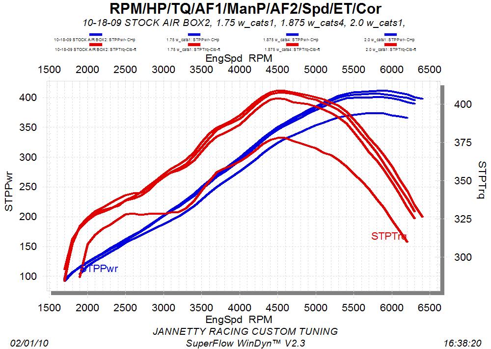 2.0 long tube headers w high flow cats Peak 411.7 HP 408.9 TQ