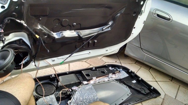 Remove Front Door Panels. Remove the trim pieces at the door grab area and behind the door handle. Remove 5 10 mm bolts and 1 T30 bolt. Carefully use a plastic trim removal tool to pry off the door from its clips. On the left door there are four harnesses to remove. On the right door, only three. Also remove the door unlock mechanism. Grab a buddy to hold the door while you remove all the electrical connectors.