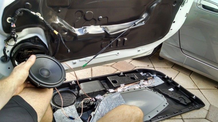 Attach the front speaker adapter to the door. Bring the door panel to the car and grab a buddy. Attach all the electronics, including the speaker wires. I used crimps myself.