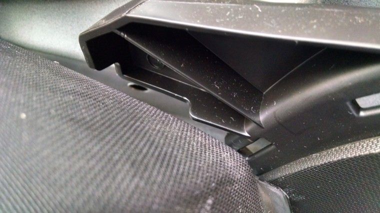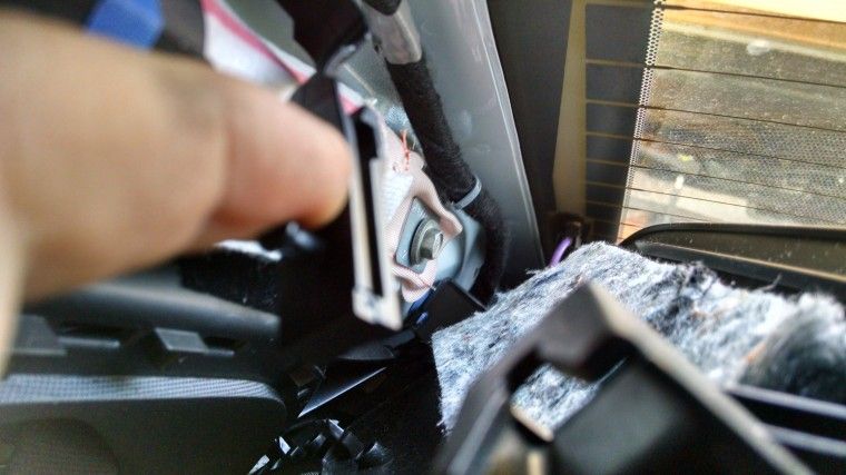 Finally remove the rear deck. Definitely need a buddy for this one. Remove the plastic trim screws that are attached behind where the seat back would rest against. There are 4 of them. Use the trim remover to get them off. Now Crawl under the deck and push the purple/metal clips up while your buddy pulls back and up. It is a real pain but requires some strength and patience to un-budge the felt plastic clips pictured below.