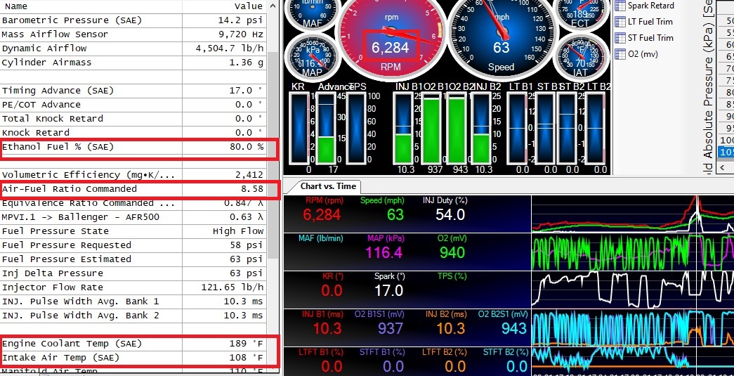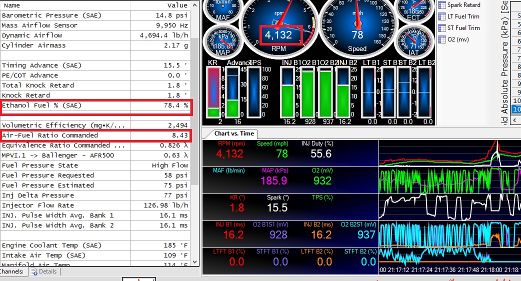 ![]() Now, few minutes later, did it again -- started out great, then literally a split second later, went right to 0% Ethanol: Looking good here: ![]() Now, 2 rpm more, 0% Ethanol: ![]() So, it acts like an electrical issue from what I'm seeing here -- its just sudden -- from ~80% to 0 in just 2 rpm -- and this happens for the next several tests. Working the electrical/heat angle (did check the fittings -- no leaks anywhere just to be certain). -Don