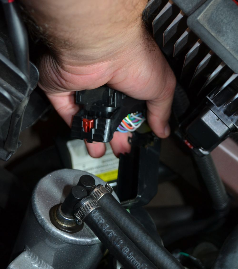 First, I had issues finding the video of removing the plug on the PCM. It had been deleted by the owner. I did eventually find it but they forget to mention about the button so I figured I would post some pics. The red tab is a pull up/push down locking mechanism. You'll want to pull up on it to unlock it. Then you'll want to push in on the button just above the red tab at the same time you'll need to pull up on the main lever of the plug. Then you'll want to wiggle the plug a little from left to right and then pull up some from the bottom. Put your hand on the PCM because it will try to come off of it's clip as well. You will also want to remove the cover that goes on top of all the wires. There is a small locking mechanism at the bottom on both sides. Just use a screwdriver to pry up on the tab to release it from both sides and then it will pull off. This will give you acces to tap into the wires.