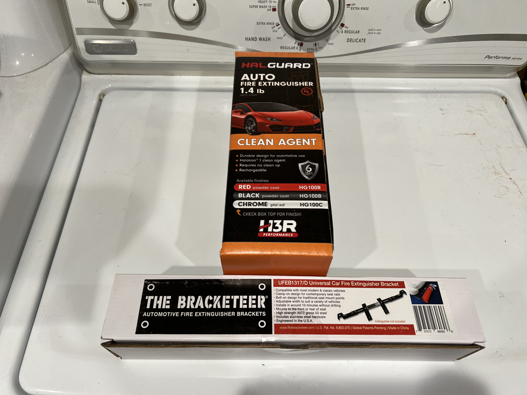 I installed an H3R HalGuard 1.4 lb extinguisher that I have been meaning to get for a long time now. However, I was struggling with finding a good mounting solution as I wanted to keep it close to the driver’s seat while not getting in the way. So I ended up going with a product called ‘The Bracketeer’ which has a wide range of mounting options.