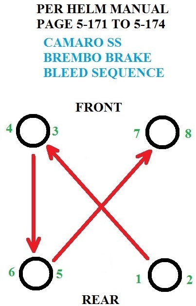So, here's my take on it: Note that Brembo calipers have two bleed-nipples (one inner and one outer) per wheel. These questions came up: • What caliper do you start with? o Answer: Right rear • What order do you follow from one caliper to the next? o Answer: Crazy criss-cross pattern Right rear Left Front Left Rear Right front • Which bleeder nipple do you open first? o Answer: Always bleed the inner nipple first. Per my research: When bleeding Brembo two-bleeder calipers, be aware that there is a "crossover" passage that allows fluid to travel from the inner portion of the caliper to the outer portion. The rationale for bleeding the INNER valve first is to prevent any upstream debris from being forced downstream into the crossover passage. The four-volume Helm manual for my 2011 SS Camaro (with factory Brembo brakes) specifies that the four-corner SEQUENCE for bleeding brakes is as follows: 1. Right rear 2. Left front 3. Left rear 4. Right front This criss-cross sequence is per page 5-173 of the Helm manual for the 2011 Camaro SS. This criss-cross bleeding pattern is not at all intuitive to me. I'm just reporting what the factory manual specifies. This same criss-cross caliper sequence, and also the inboard-then-outboard bleeder valve sequence, applies whether the job is done MANUALLY or by PRESSURE-BLEEDING. If you have any doubts about what the manual specifies, or if you think I've confused the content in my report see it for yourself in the 5-page file on Google Drive at https://drive.google.com/open?id=1oT...R79Pc3ZCmUV1HP With regard to the idea of upgrading to six-piston calipers, I don't know why any of this sequence would change just because you might switch from a four-piston Brembo caliper to a six-piston Brembo caliper. |