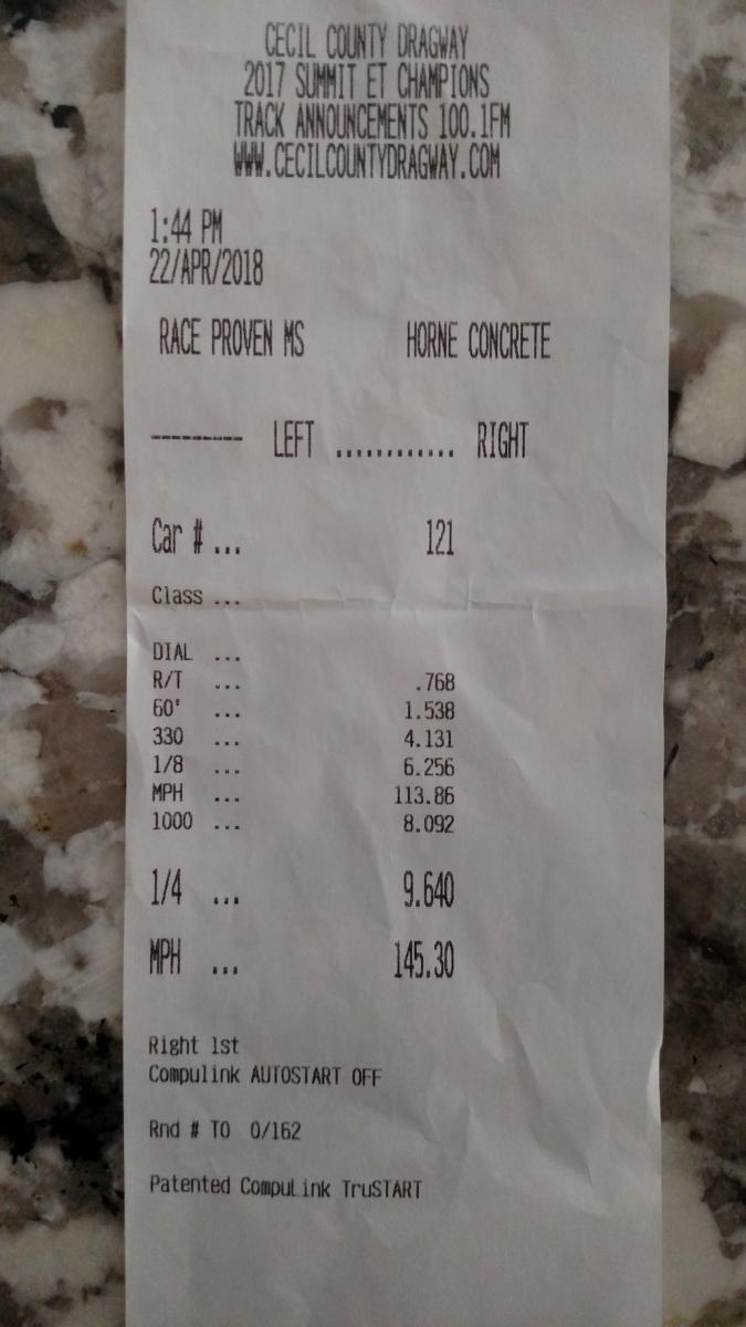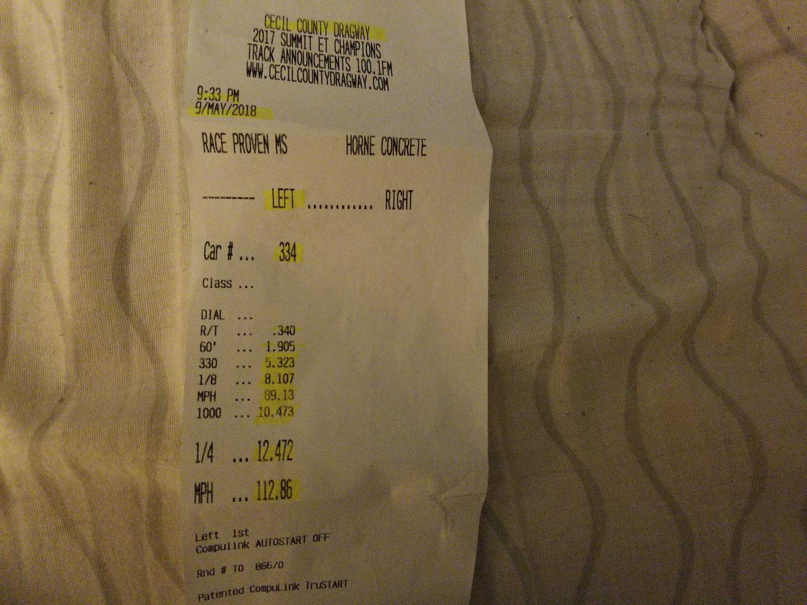 Performance Mods (if any): Headers, Exhaust, PTB, Tune Category submitted for: Category # 13 Camaro 1LE Plus Bolt Ons R/T............ .243 60'............ 2.162 330'.......... 5.641 660'.......... 8.441 660’ mph... 89.47 1000'........ 10.805 1320'........ 12.806 1320’ mph. 112.75 Name of the track: Island Dragway Date of pass: 4/20/2018 Weather conditions: (include Density Altitude, if known): 44*, 45% humidity, -781 ft DA Figured I would post this since this is my last one before going FI. I dont know why it says 4/21/2018 at 2 am but it was on 4/20/2018 around 8:30 pm (thats around when the picture of my time slip was taken on my phone). |