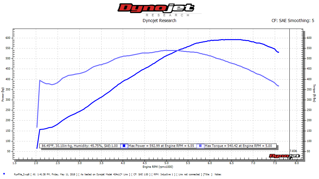This round was a MSD intake manifold, 102mm Nick Williams TB, flex fuel, injectors, and the dyno run was on C85. Previous mods were a cam, ARH long tube system w/o cats, Springs, guides, rods etc that previously bumped me up to 548/508.