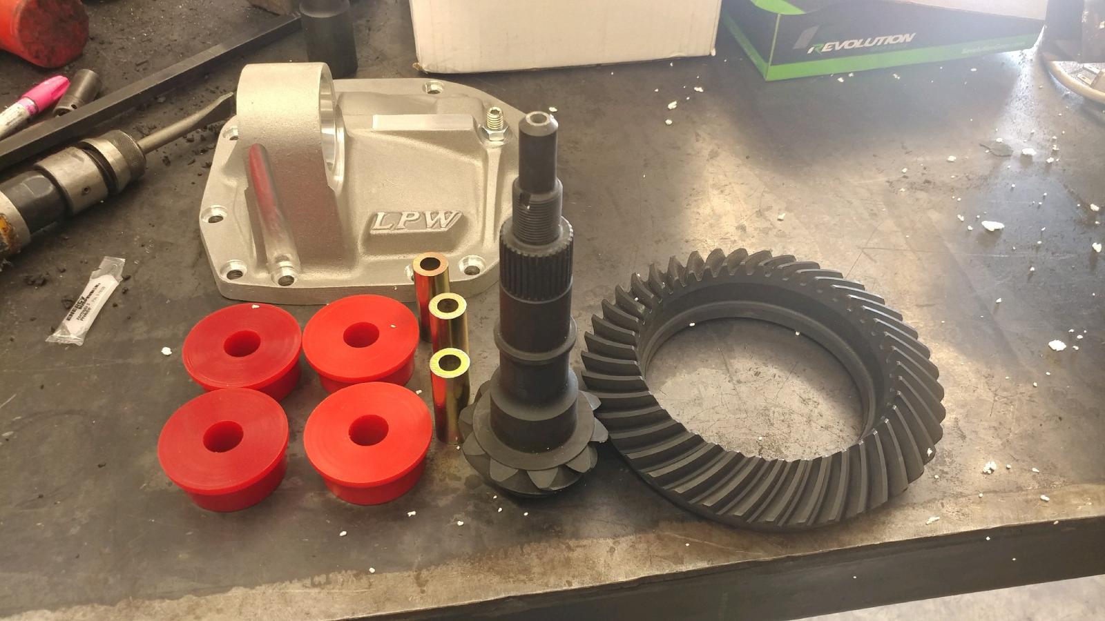 -Pegasus cradle solids -Yukon 4.11 (not much of a change to the 3.91, but we were in there anyway...) -LPW Diff cover -BMR poly/delrin diff bushings I'm too lazy, got a great local shop, Johnson Automotive in Manchaca (Austin)