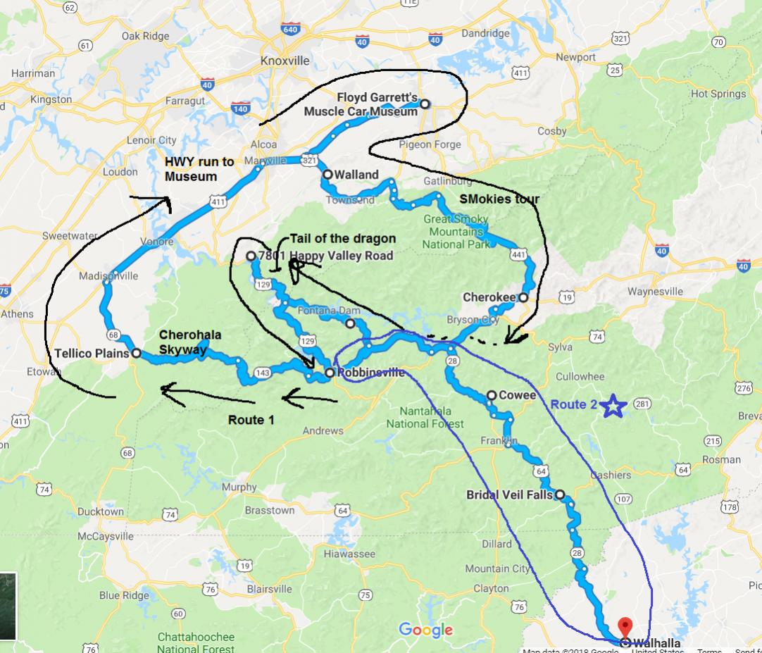 I created a route. There is a "Main Route" and an Optional Route 2..for giggles to complete the Moonshiner 28 route to SC and bridal falls, and back in one day. Main course is the "Route 1" that will include alot of the Major twist roads, Tail of the dragon 2x, and a random stop off at the museum (of course, optional, but its really cool!).