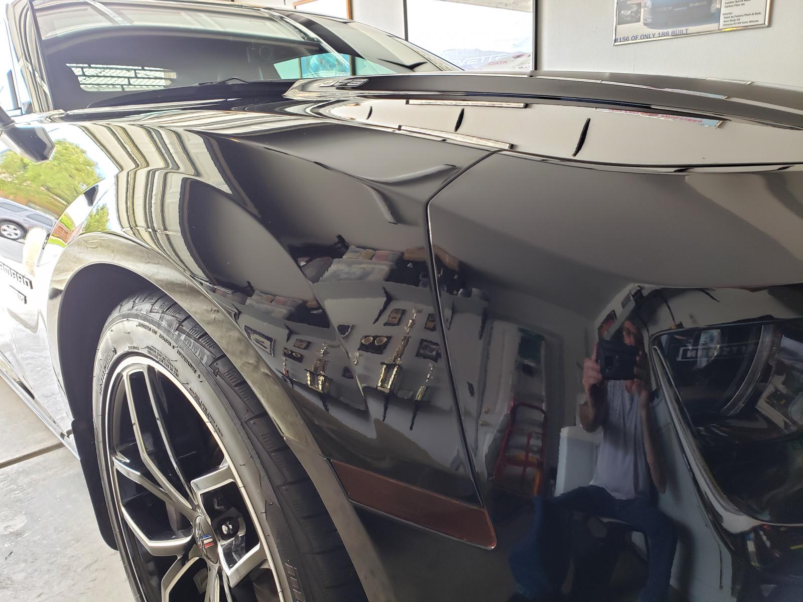 Had to run down to Vegas the other day, hit several pockets of bugs along the way. Spent this morning cleaning them off; when I sat down to take a break and drink, noticed this reflection and had to take a picture. Still puts a smile on my face every time I see and drive it; amazes me how good it still looks after 6 years.