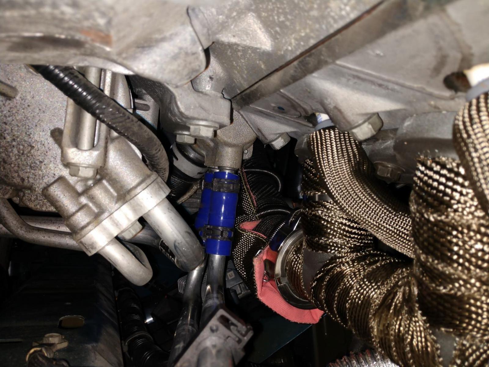 Connecting the heater hoses was a little different since I had changed the stock ones years ago. I clocked (or twisted) the aluminum pipes about 75 degrees, and used some silicone hoses I got from DO88, the same place I got the Cobra head from.