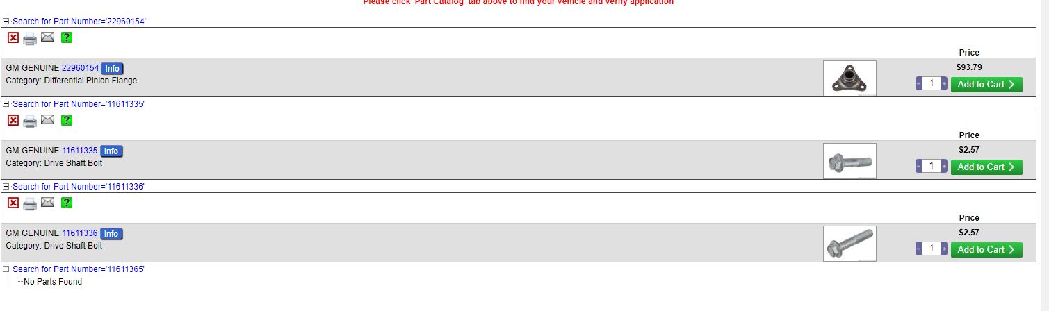 22960154 Trans flange 11611335 62mm bolt to diff flange 11611336 70mm bolt to trans flange 11611365 Nuts for trans flange bolts I found everything on Ebay but it's way over priced. Like $14 per bolt. I know some guys have bought the ZL1 driveline kit from GM and found parts to be incompatible with 1LE's. If you have this stuff, I'll take it. PM me. Also curious, for those that have done this already.... are the nuts necessary, or can I just reuse mine? I heard the bolts are wider, in which case my nuts wont fit. but I wont know until the bolts get here. EDIT: I have already PM'd anyone who has them for sale on this forum. thx