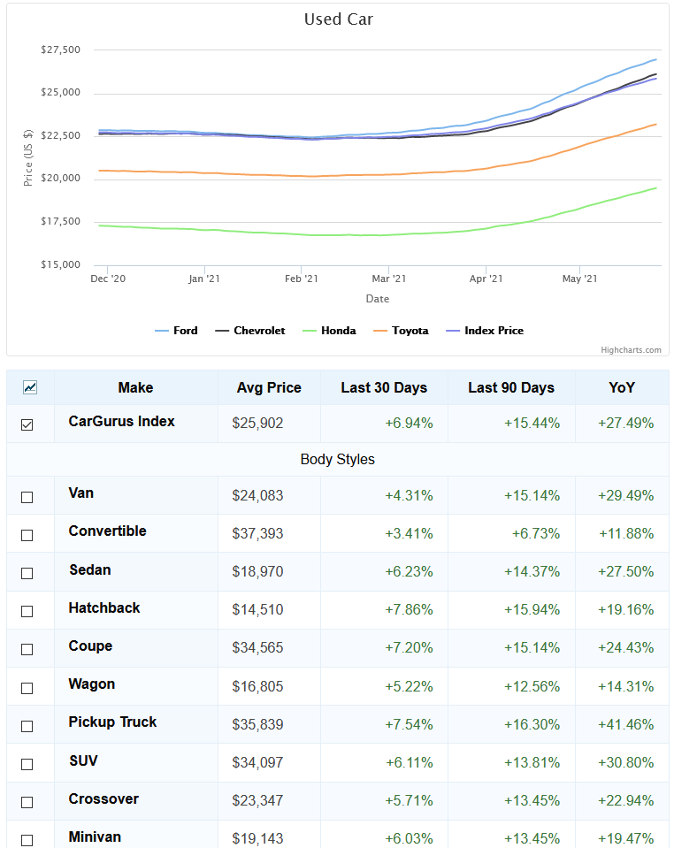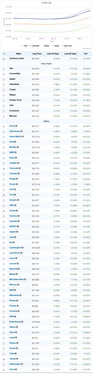 Like I thought, prices have gone through the roof on used cars (and lumber and houses). I regret giving a family member my Silverado thinking I could find a newer replacement easily, note how they've gone up 41% !