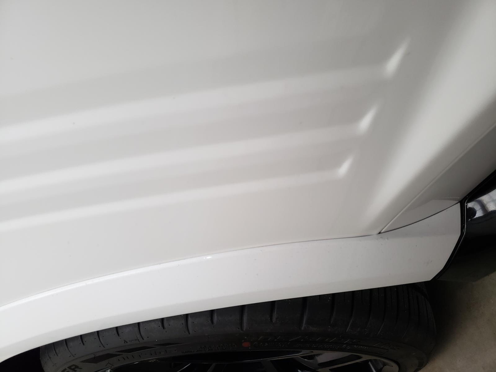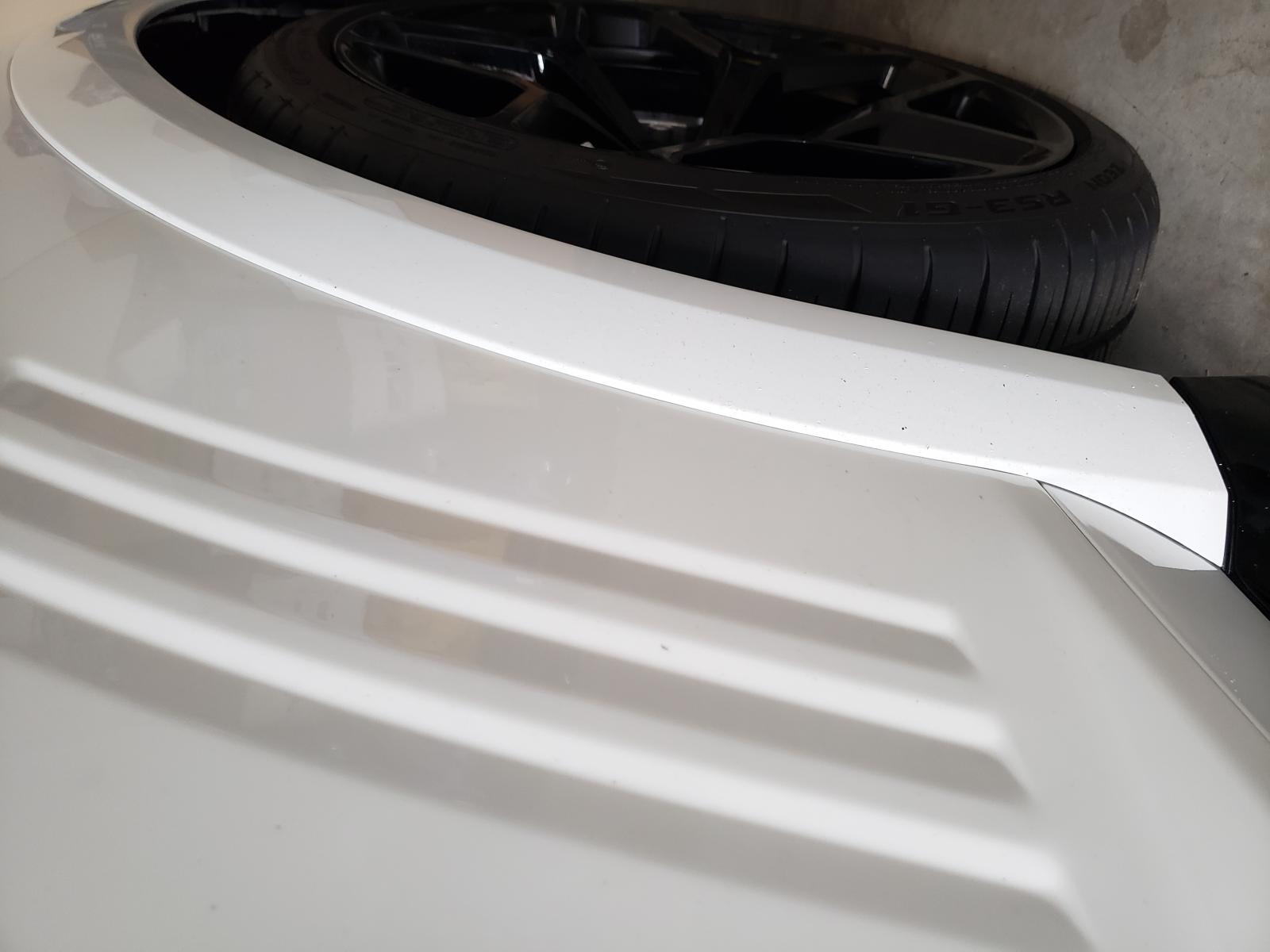 Pictures in front of the Drivers rear tire and Passenger side wheel flairs have some "peppering" from debris, from driving. Easily touch up as needed. Drivers side gets all the abuse, passenger side not so much.