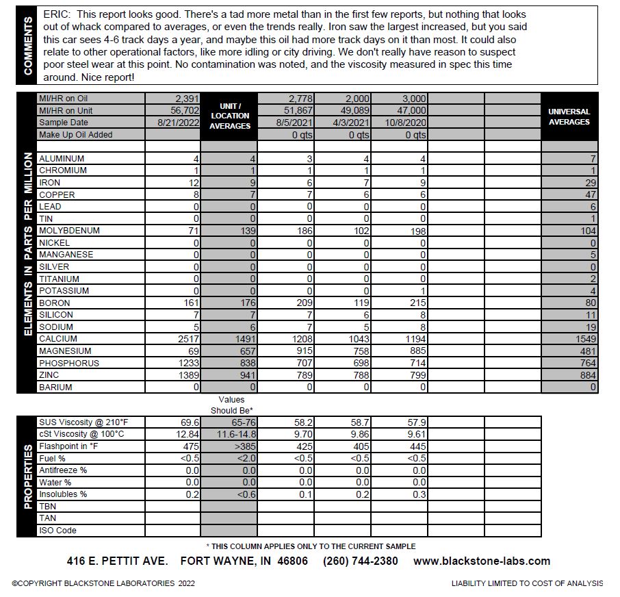 I love Blackstone. After every track season, I send a sample to Blackstone to make sure she is good for another season. Last year, I did the most track days yet on the oil. I probably have about 5 of their mail-in kits on my work bench.