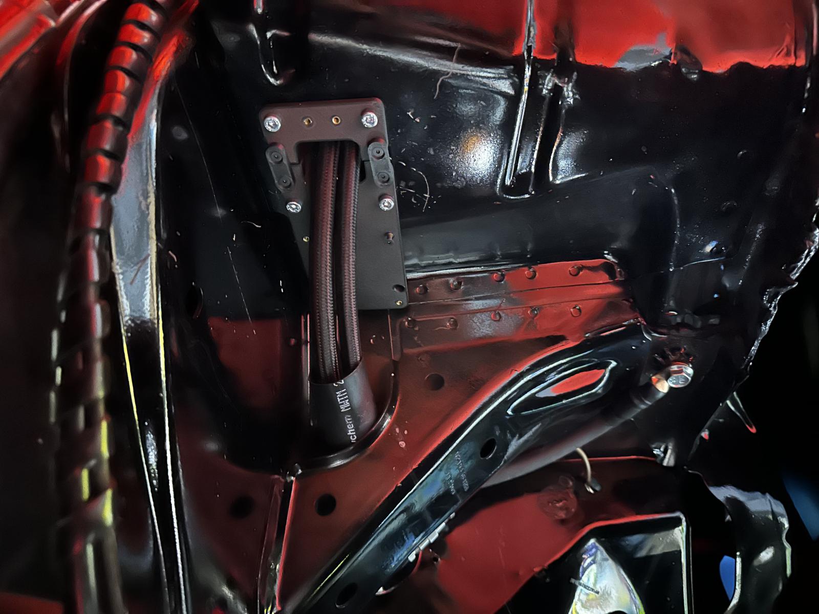 Fuel Filter with stock FPS mounted on outside of frame rail. Flex Fuel sensor is mounted just in front of the tank. Fuel lines run into the wheel well and up through the cabin filter. From there into the cowl and exits behind the intake. Fuel pressure regulator mounted on the timing cover and hard lined return to the firewall. Everything is PTFE. I am designing a cover for the lines in the wheel well, Still a work in progress.
