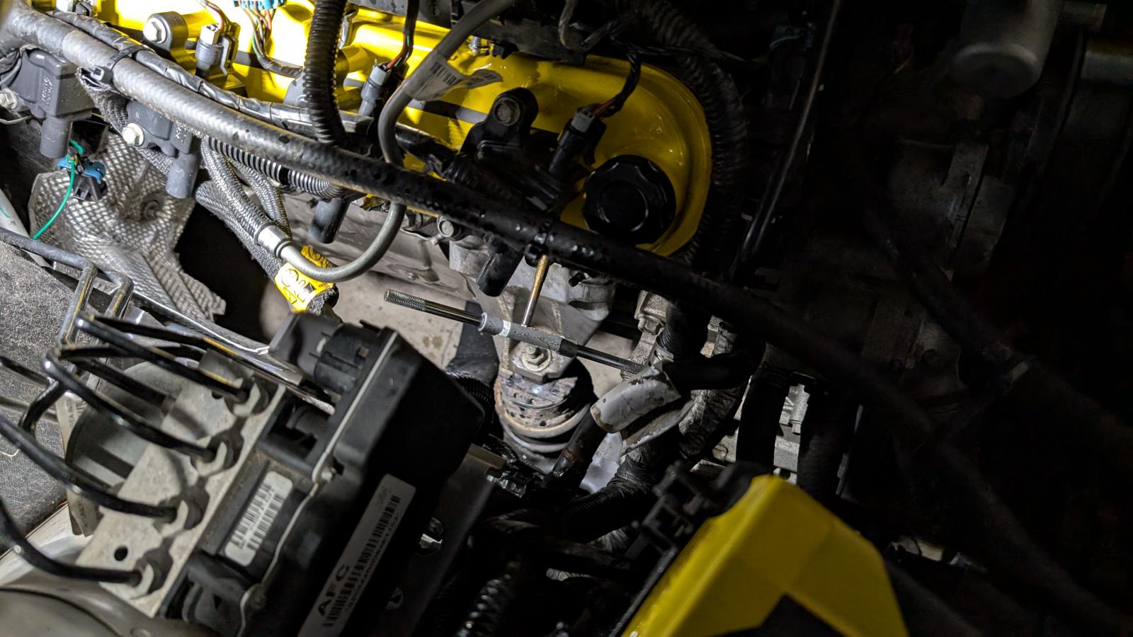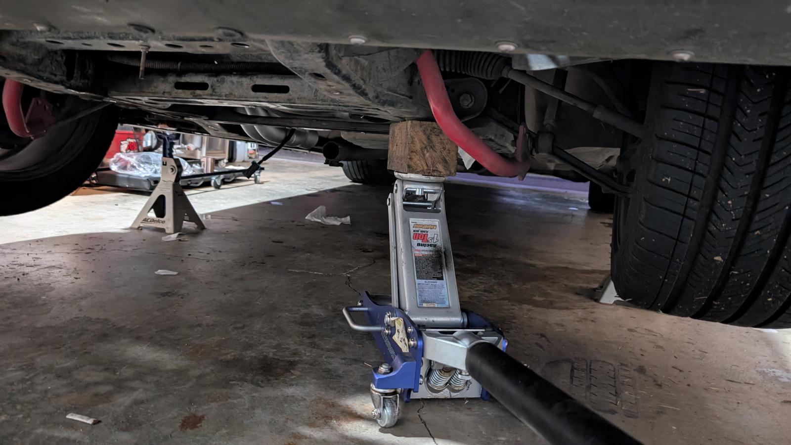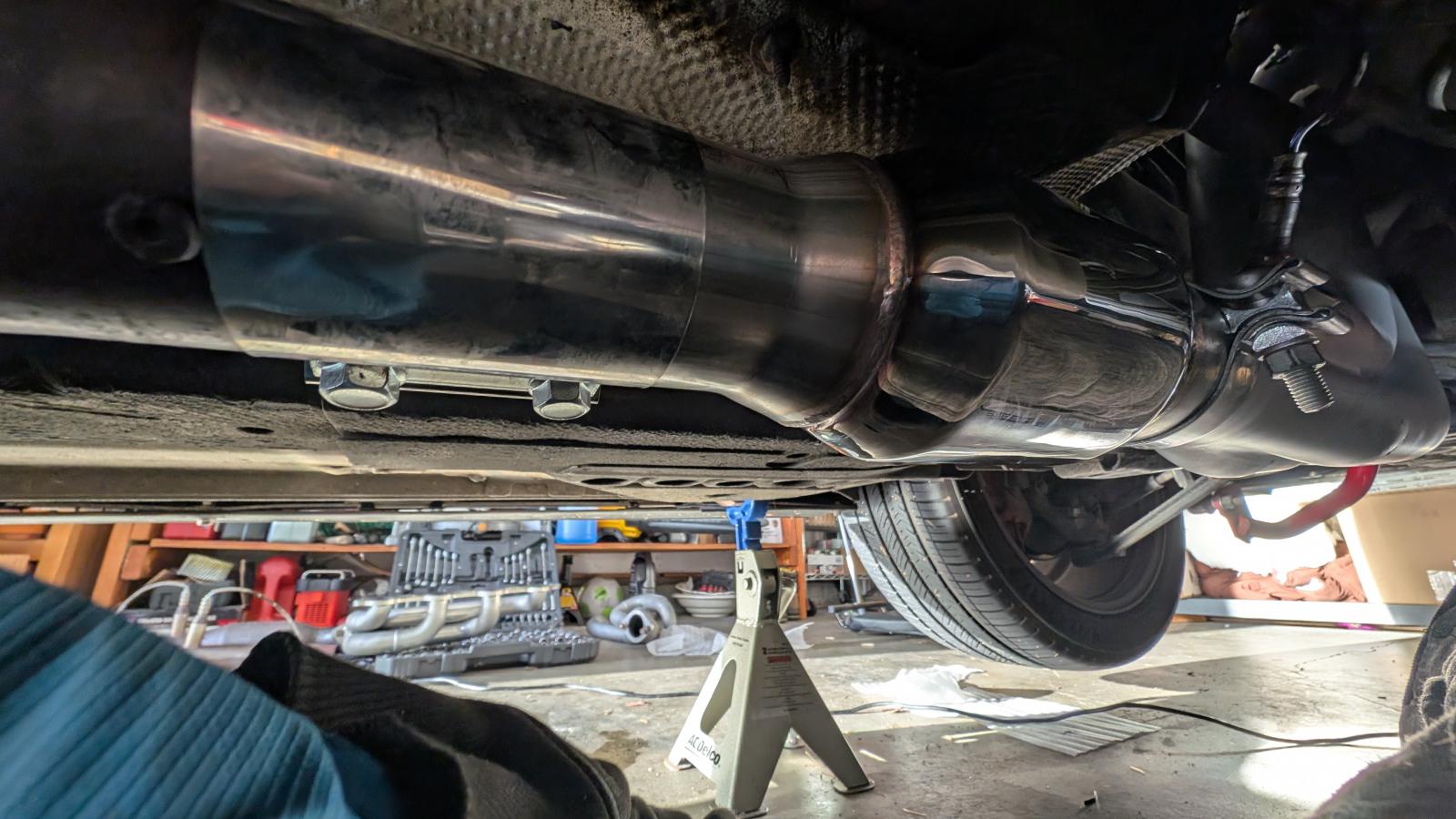 Started by removing my old shortie headers, was able to drop the one on passenger side directly under the car, driver side one had to seperate and remove in two because of the steering rack, then went in and took the ol threading tool to the heads, it did remove a fair bit of material so I think it's now got threads in threads but it's better then it was, just have to be careful with the torque on passenger side so I don't spin them Then I proceeded with the headers, I had them ceramic coated so I tried not to scratch them, laid down some wrapping material and everything, it went in smooth on passenger side but driver's was a nightmare, spent probably an hour or two struggling but it kept getting caught on motor mount, steering rack and a little square poking out of Bell housing, I ended up doing it by raising the car nearly 2-3 feet up was just few inches shy and ended up using a 4x4 post chunk to get it final bit over (fun fact, same chunk that dropped the car on me last year but I was out of options, also maxed out the jack stands and as you can see in pic below even that wasn't enough) With that done I called it a day and figured I'd do the cats next day and call it early because Christmas Eve, what I didn't realize is that the cats are almost flush fit with exhaust so while I was able to shimmy the tubes enough to mount cats on collectors the cats to exhaust was a different story, I originally intended to use stock clamps because I know they work, but because of the stupid locating screw and bump I couldn't slide them all the way down the pipe on resonator side and they were too long to slide on the cat side, so I settled on what I had which is a set of ebay special Chinese ones I could just wrap around the pipe, they almost certainly are leaking but it's something