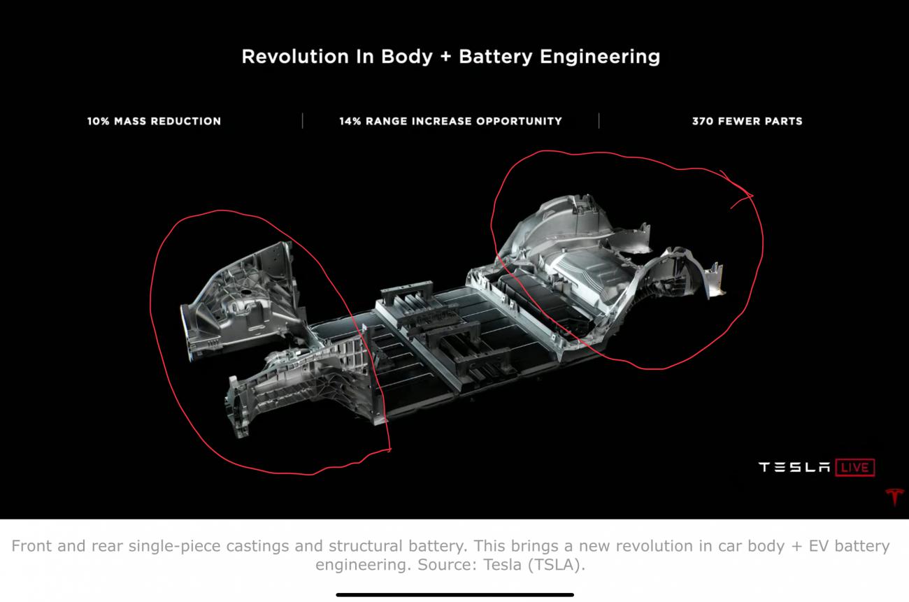 You make a good point. Something I had completely forgotten about. At one point Tesla was saying they would progress to a single gigacasting to produce the entire underbody. That would have been a huge investment and would have locked them in on many elements of design. They have since moved to a strategy where there are (3) major components of the underbody. A front gigacasting, a rear gigacasting, and the skateboard that holds the battery box and motors. Going to a single gigacasting would have locked them in on wheelbase and track. They have also removed the floor from the vehicle frame, leaving the top of the battery box as the vehicle’s floor. In the picture below I’ve circled the two gigacastings. Each is one single cast / stamped part. For most vehicles that would be hundreds of smaller welded parts.