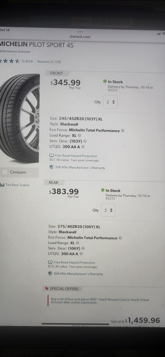 I ended up buying some pirelli Pz4s from tire rack because they were on sale for 60 percent off. |