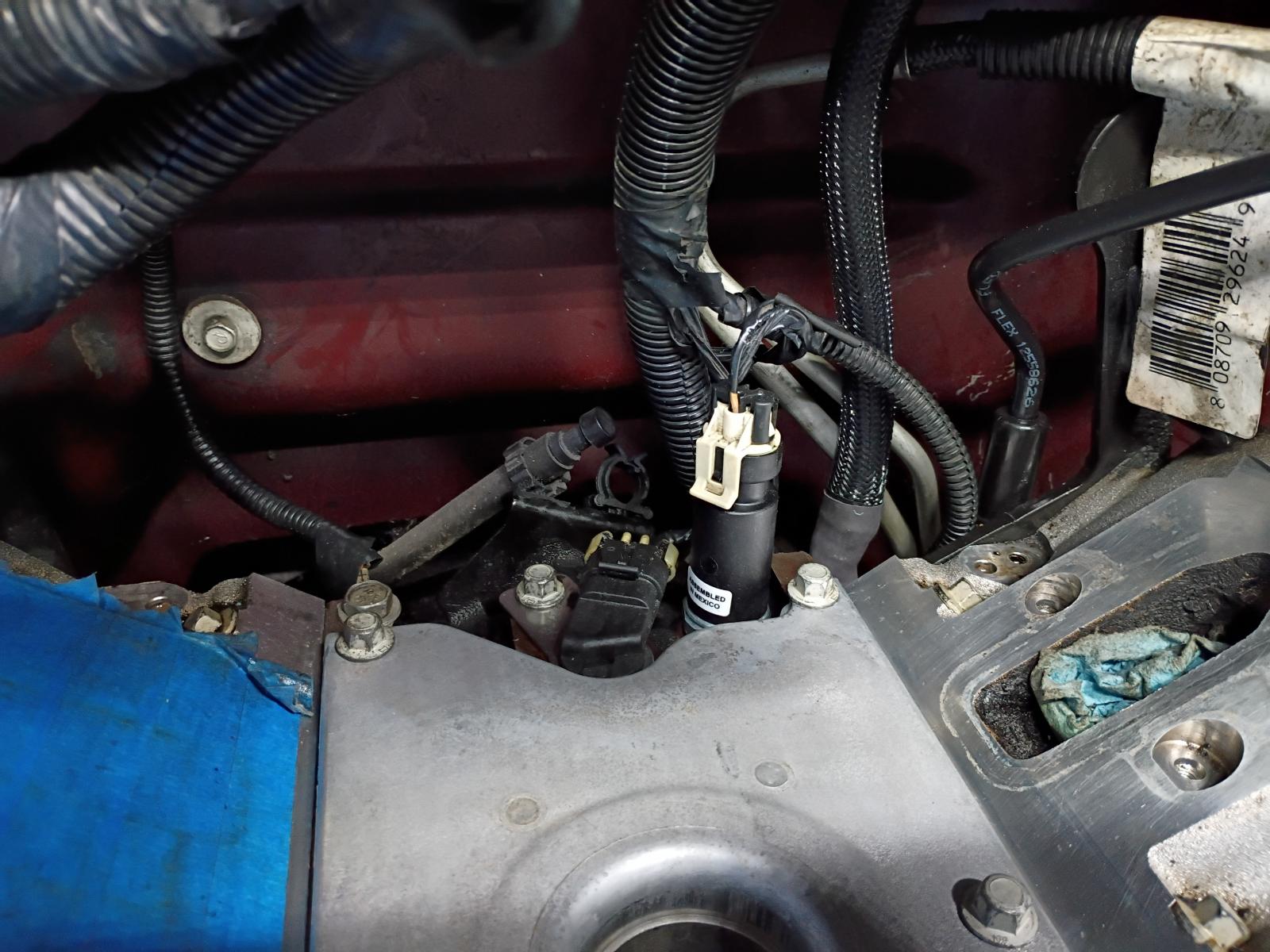 Got the replacement sensor installed and torqued to spec, finally. After that I routed my new 0 gauge ground from the back of the block to the firewall, secured the wiring harness and cleaned/re-taped the remainder of the harness on the driver side. Moving forward, the valley pan and knock sensors were re-installed and torqued to spec.